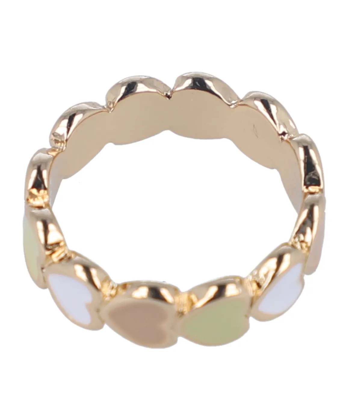 Anillo metálico con diseño de corazones multicolor.