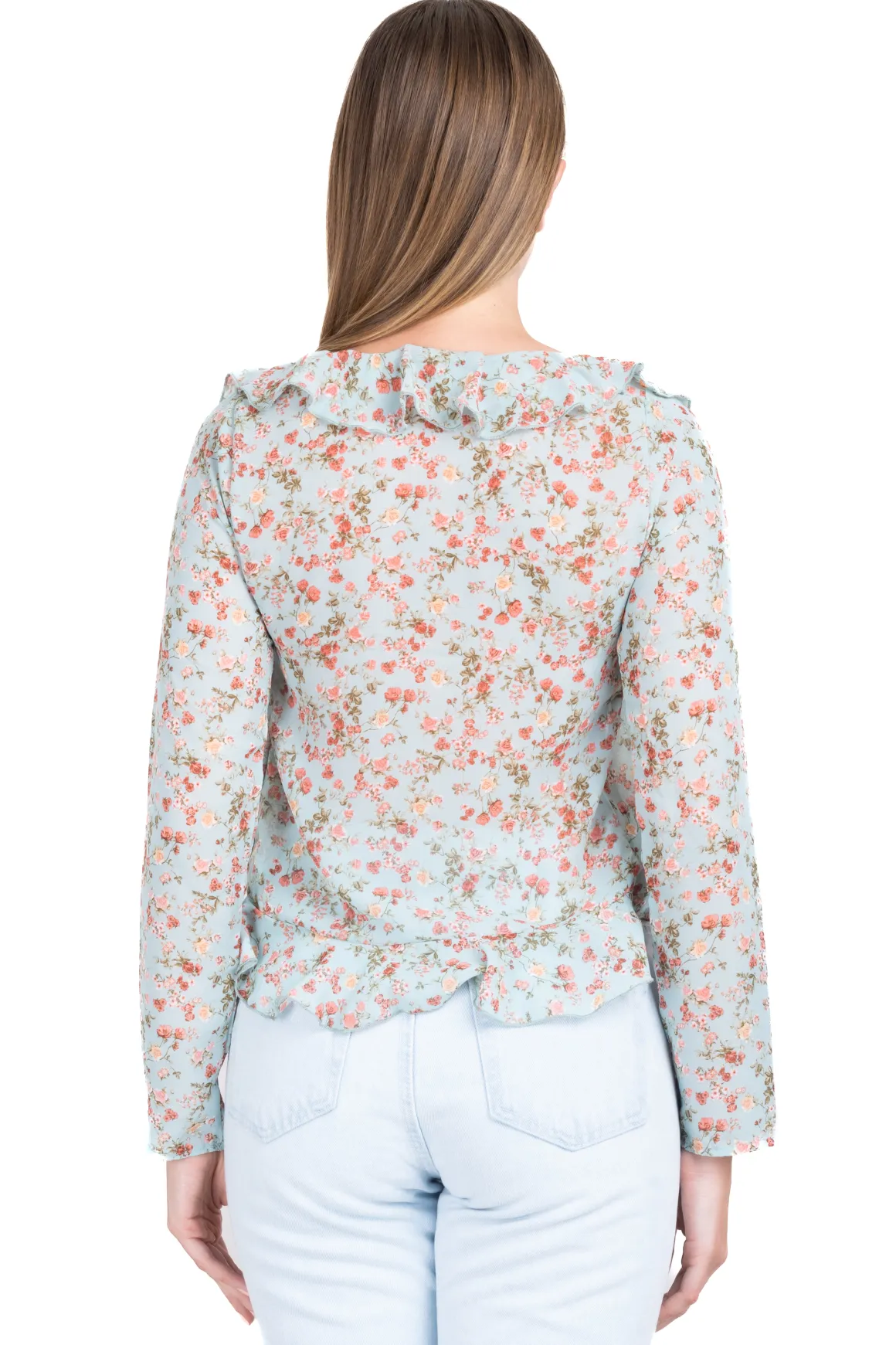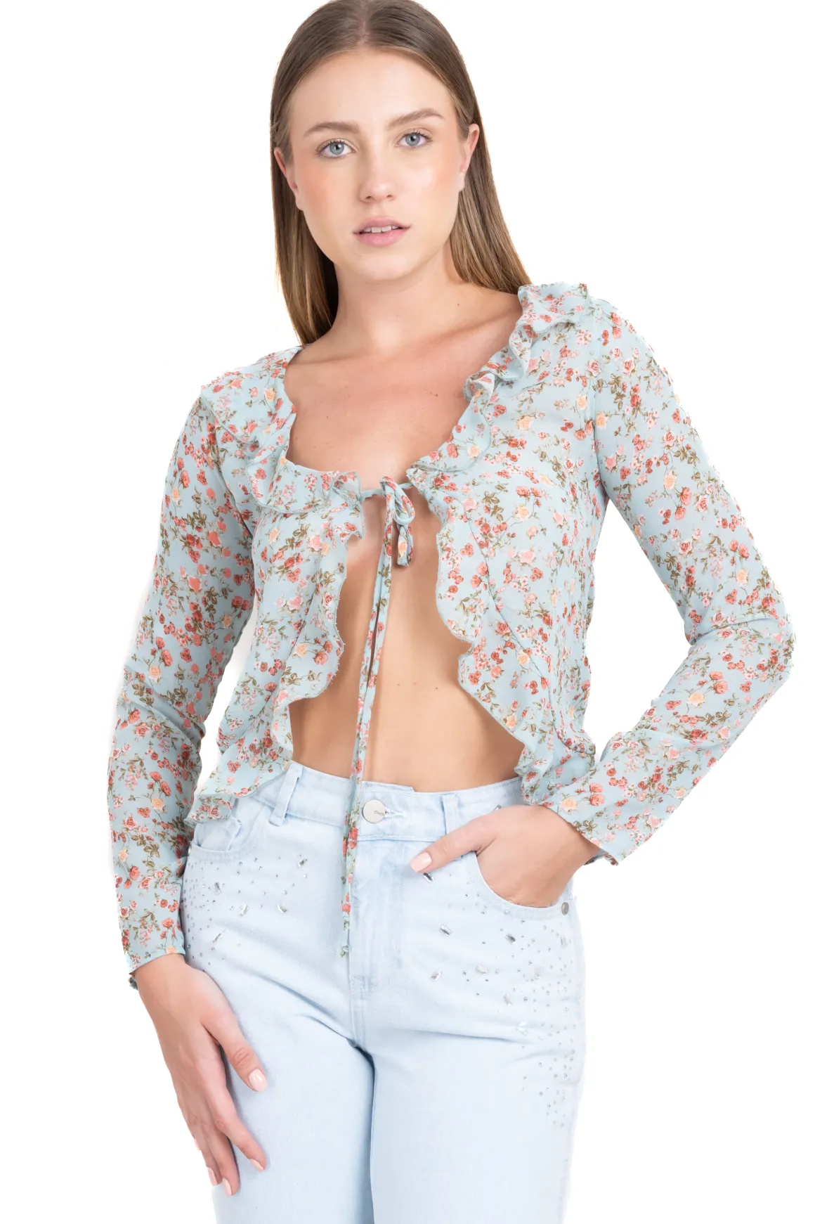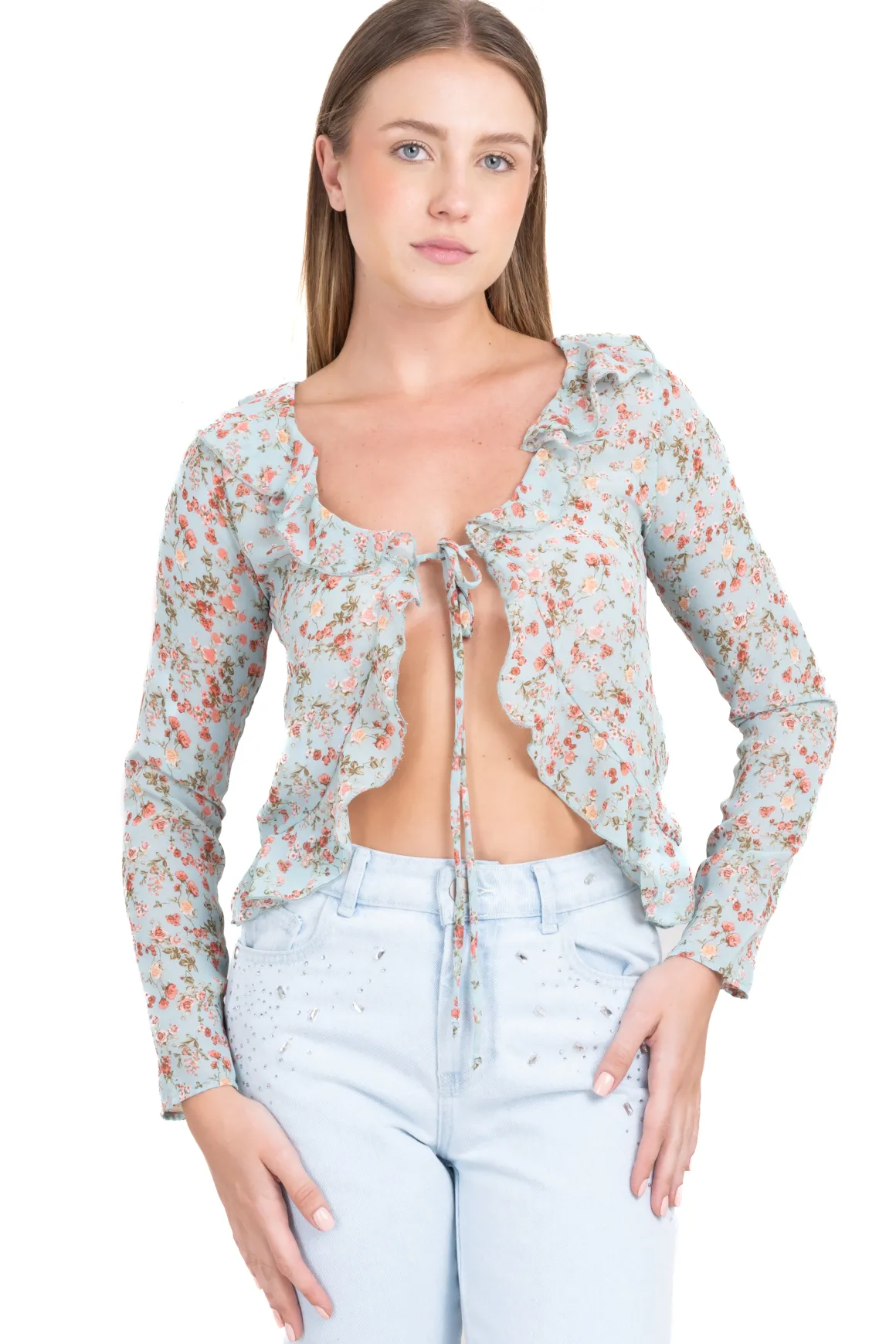 Blusa en estampado floreado de escote redondo con olanes y manga larga. Cierre en pecho con cintas delgadas en mismo estampado.