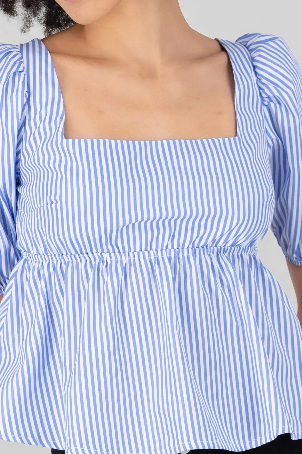 Nuestra blusa de manga corta abullonada con escote cuadrado y diseño de rayas es perfecta para un look fresco y moderno.