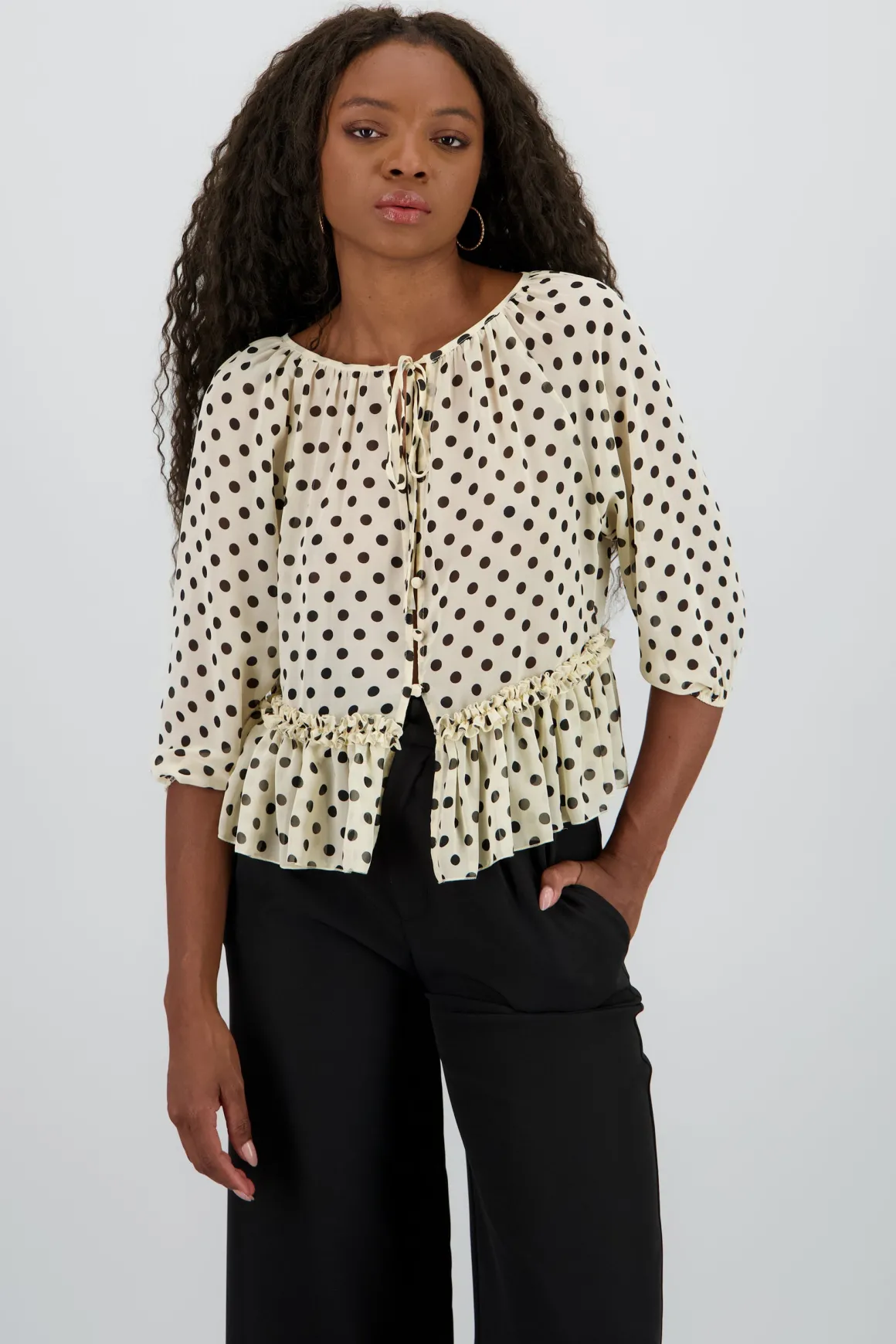 Blusa con mangas abullonadas, diseño de polkadots, cuello redondo y corte fluido.