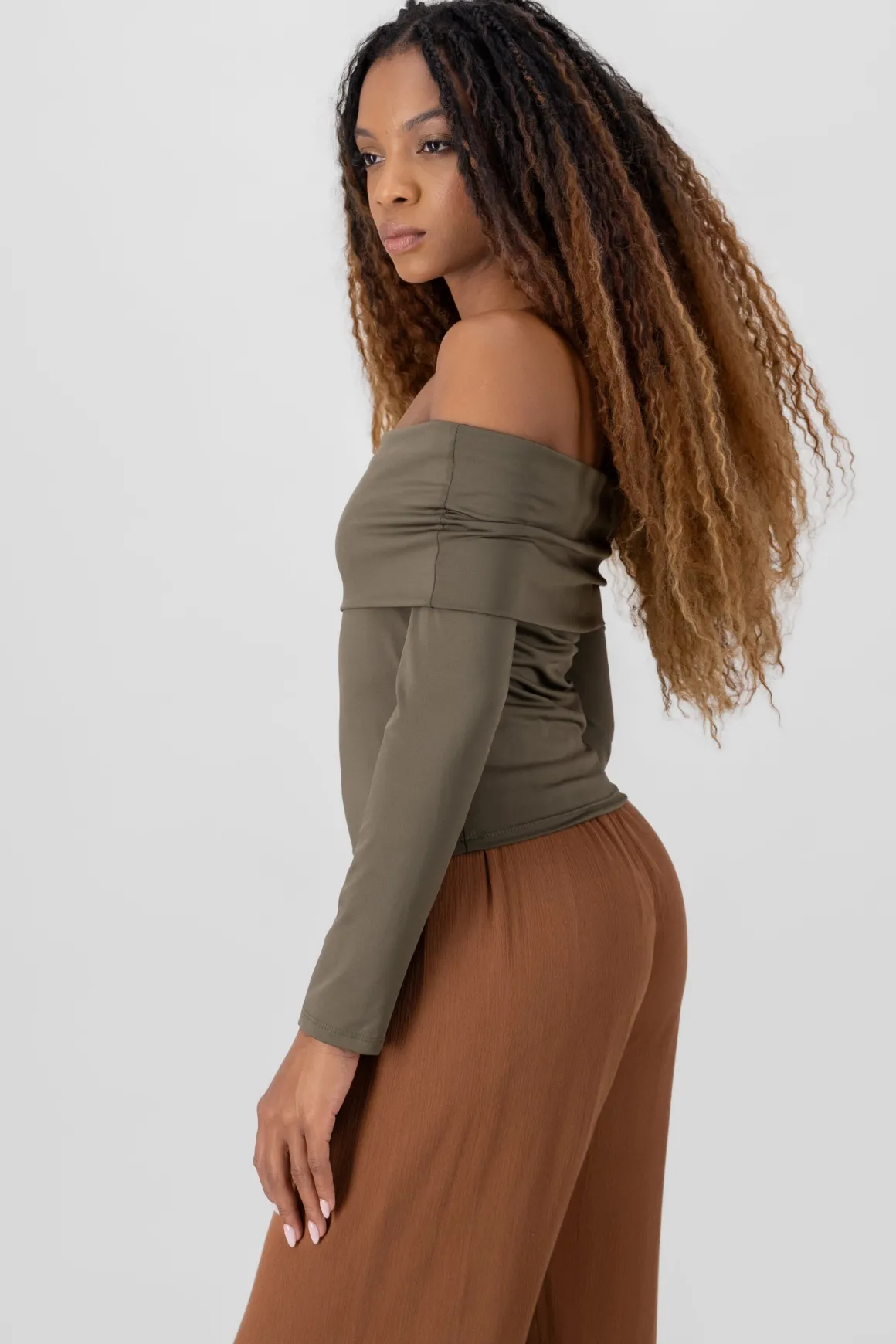 Esta blusa off shoulder es perfecta para quienes buscan un look femenino y relajado. Con mangas largas y un diseño que deja los hombros al descubierto, es ideal para crear un estilo delicado pero con mucha actitud.