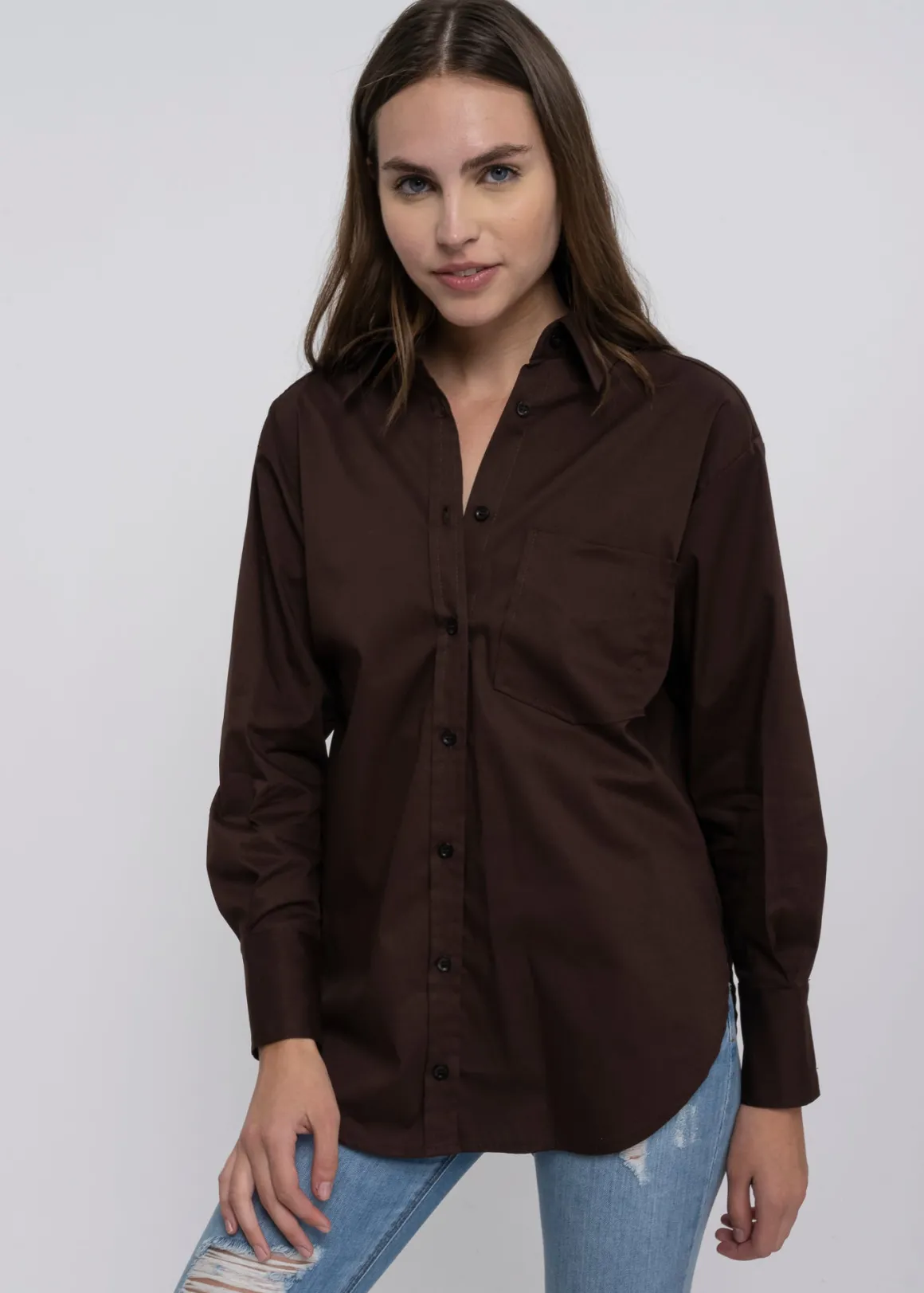 Blusa de cuello solapa. Manga larga con elevadores acabada en puño. Bolsillo frontal. Bajo asimétrico con aberturas laterales