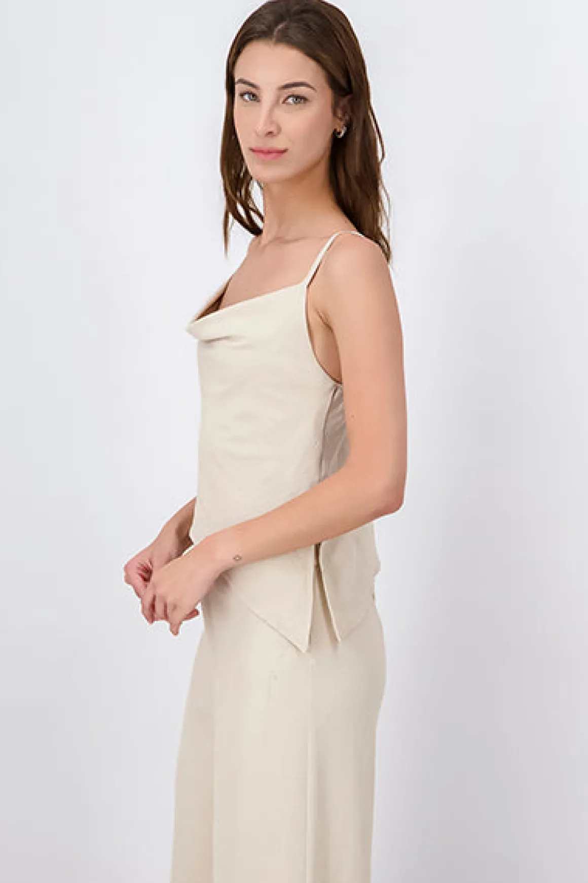 Blusa lisa de tirantes delgados y escote drapeado. Borde asimétrico. .