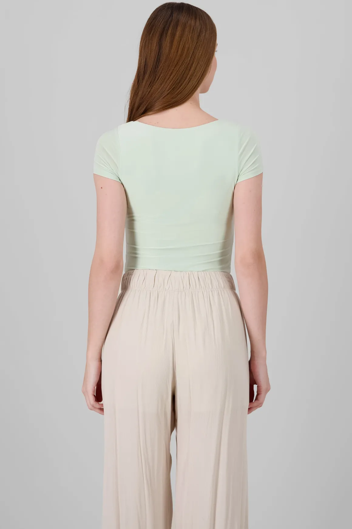 Luce fresca y a la moda con este bodysuit de manga corta y escote cuadrado. Su diseño sencillo lo hace ideal para combinar con todo tipo de prendas y estilos. Perfecto para un look casual o más formal.