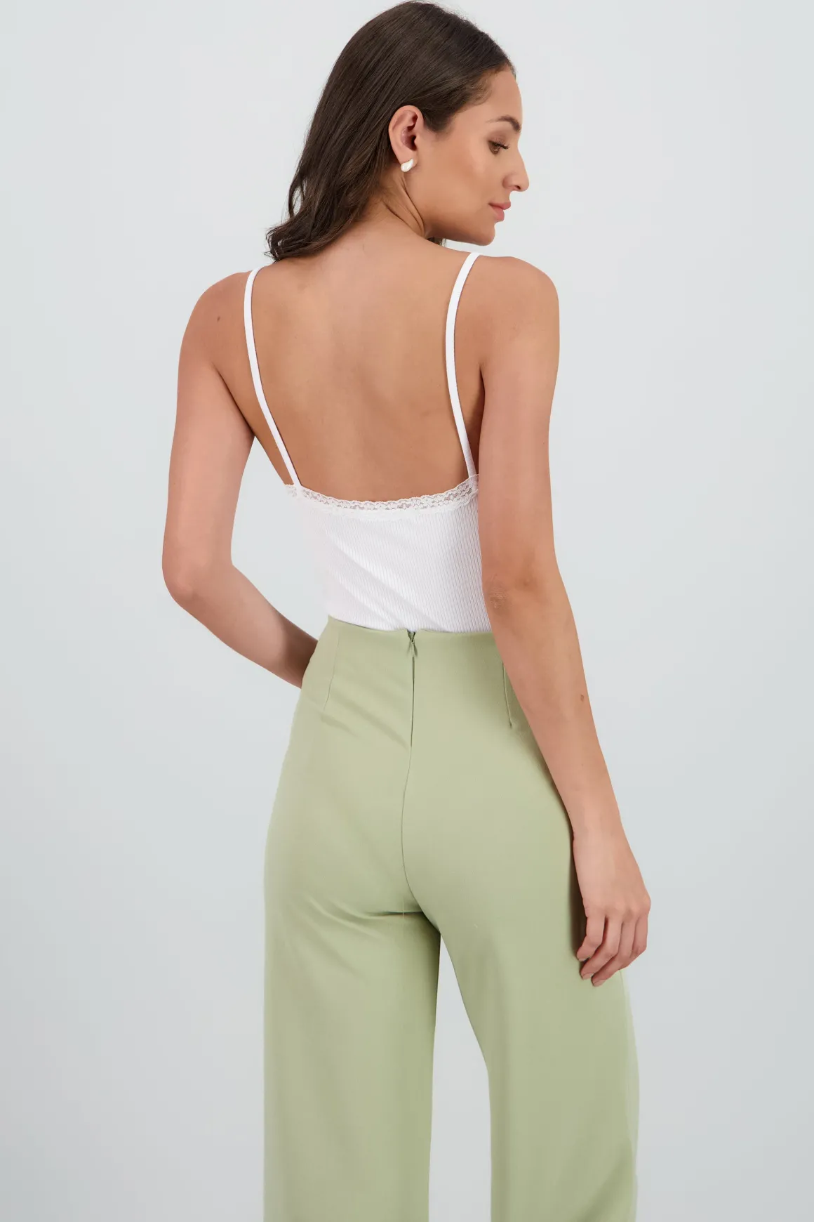 Este body es el aliado perfecto para tus looks más audaces y cómodos. Su diseño con tirantes y detalle de encaje le da un toque especial que lo convierte en una prenda versátil para cualquier ocasión.