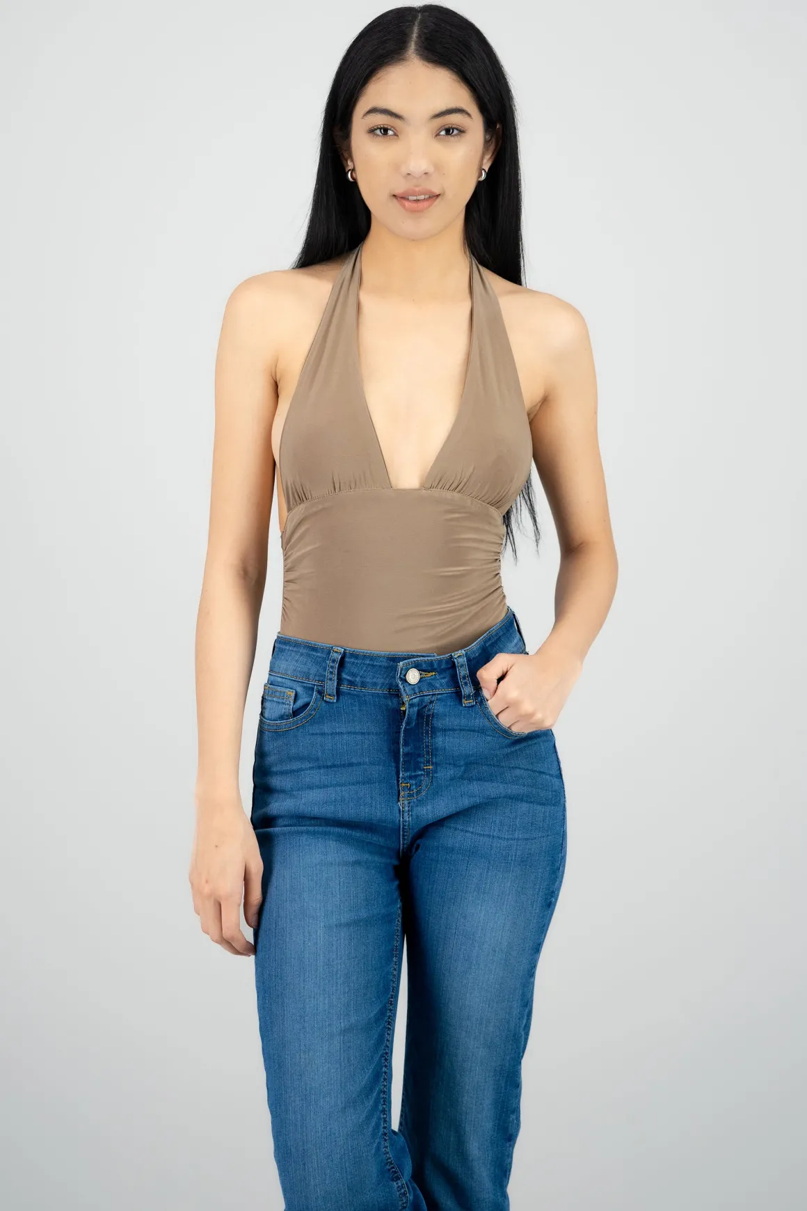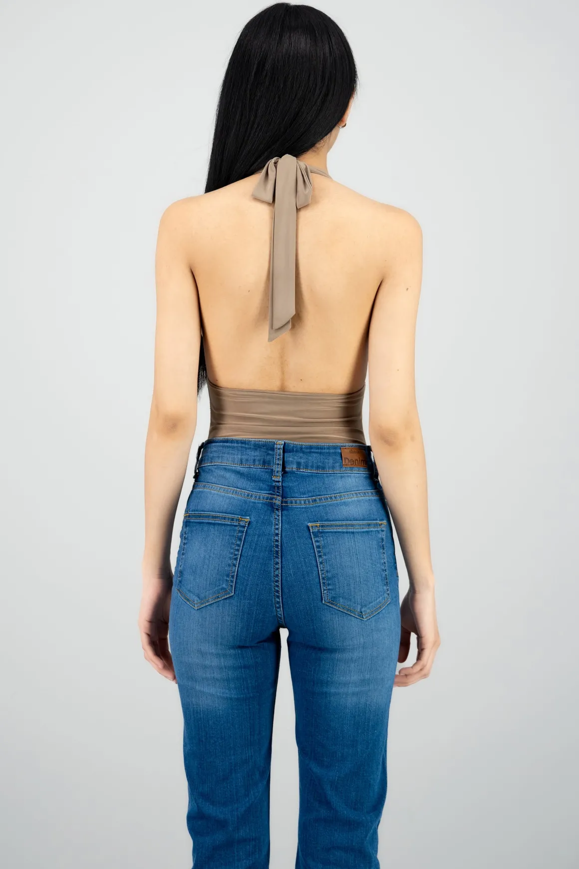 Este bodysuit es la solución perfecta para un look sin complicaciones. Con su escote en V y diseño halter, es ideal para combinar con tus prendas favoritas.