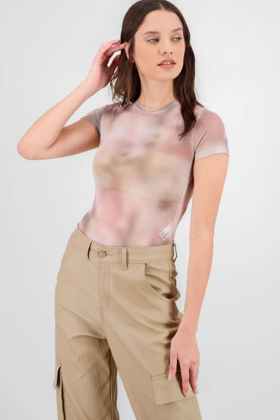 Este bodysuit mesh de manga corta es la prenda que necesitas para destacar. Con su diseño de estampado degradado y cuello redondo, es perfecto para crear un look audaz y moderno. Ideal para combinar con jeans de cintura alta o faldas ajustadas, dando ese toque edgy que buscas.