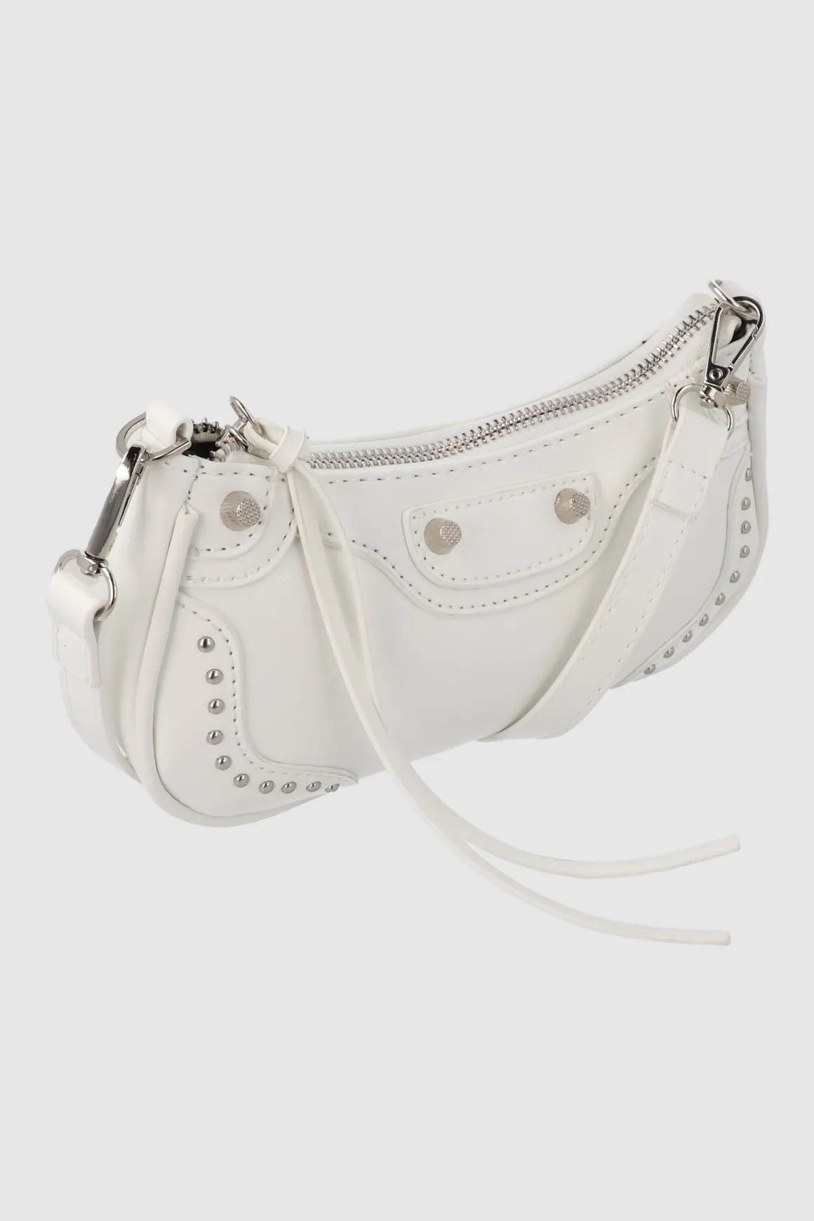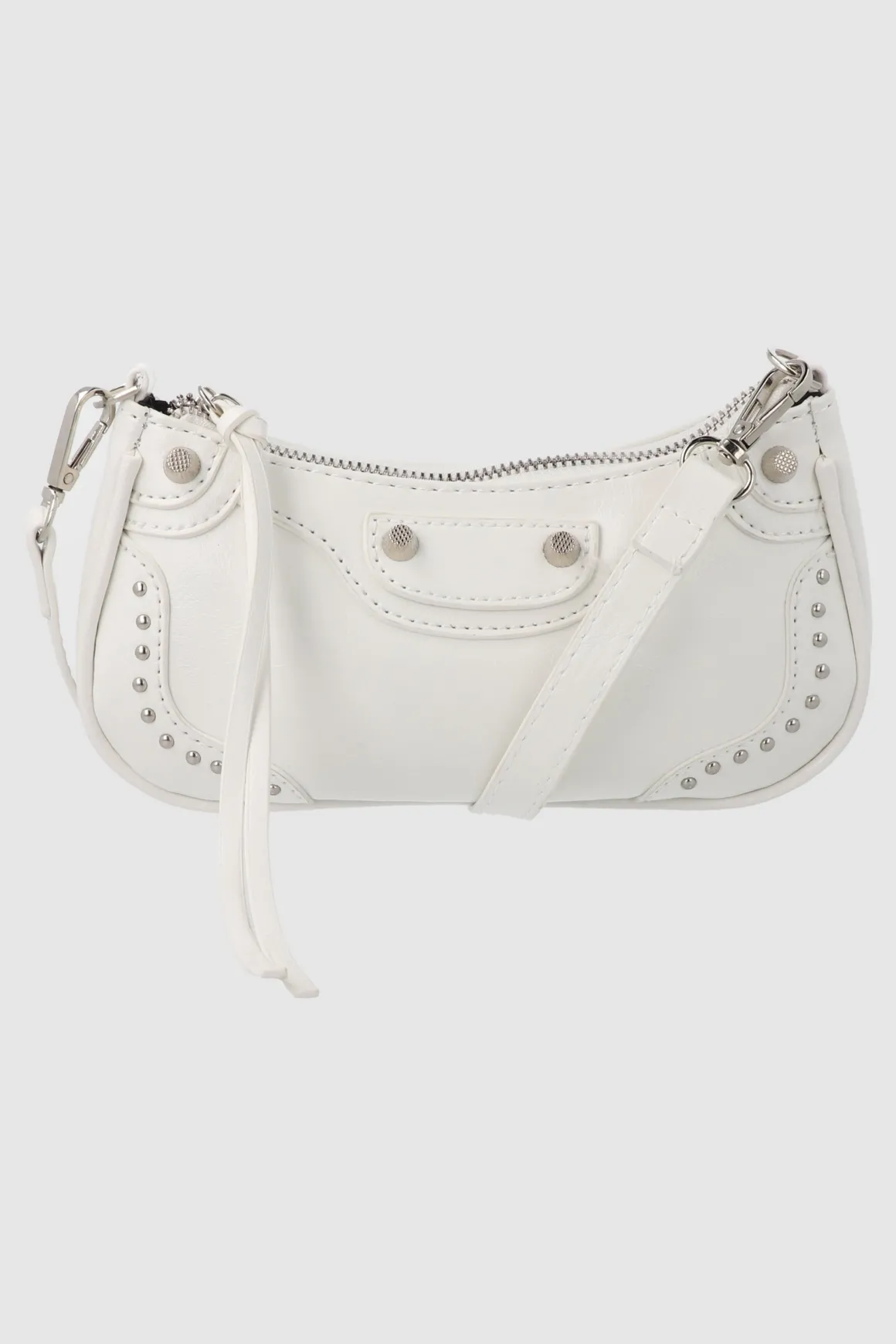 Con su diseño de baguette y cadena, es perfecta para llevar lo esencial. Sus studs añaden un toque audaz, mientras que el strap de hombro asegura comodidad.