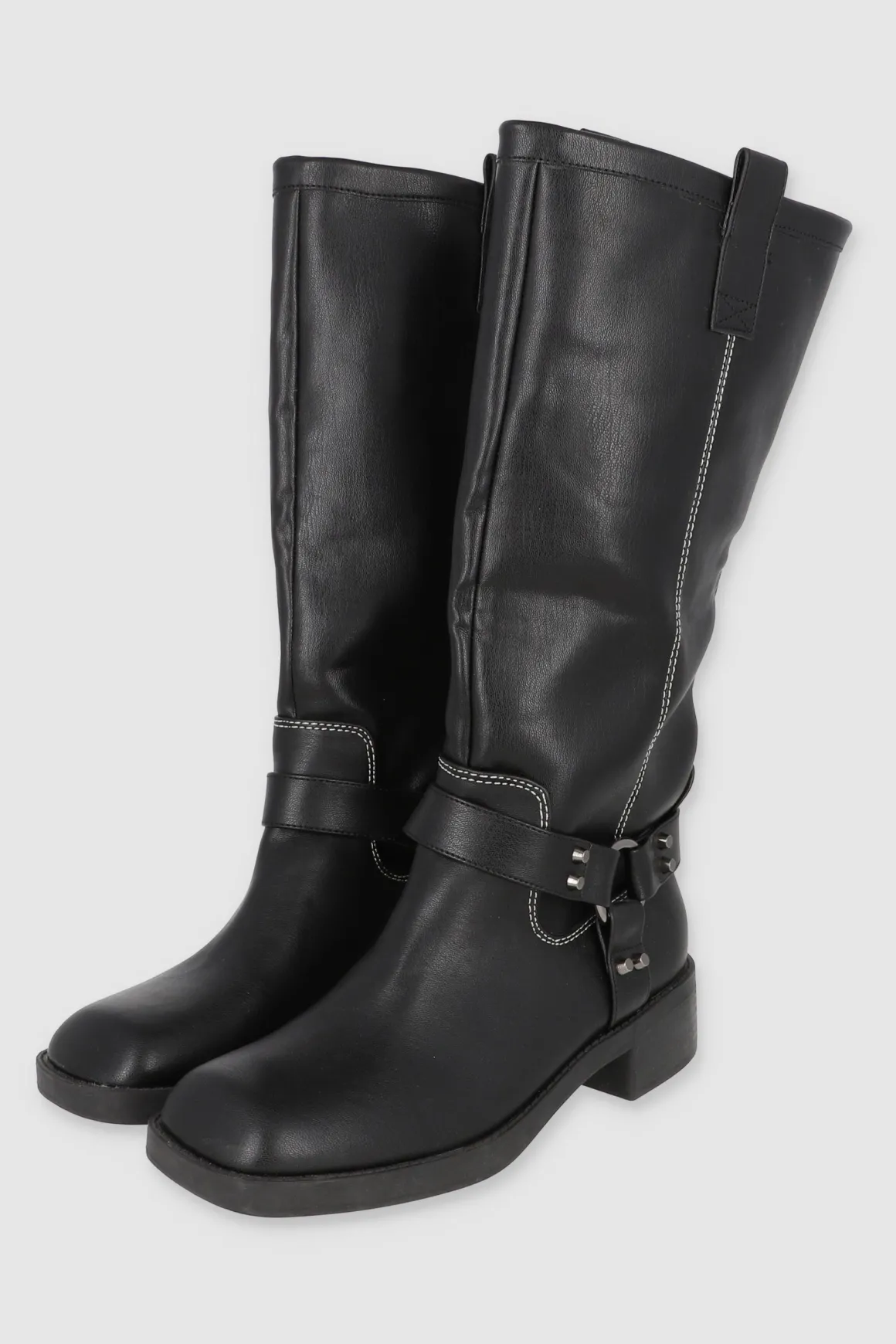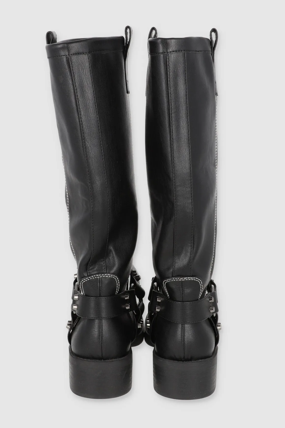 Estas botas motero largas de efecto piel son el complemento perfecto para tu estilo. Con un ligero tacón que brinda comodidad y estilo, las tiras con hebilla redonda y estoperoles le dan un toque distintivo a tu outfit. Además, los tiradores laterales facilitan su colocación, haciéndolas ideales para el uso diario o para lucir un look audaz en eventos.
