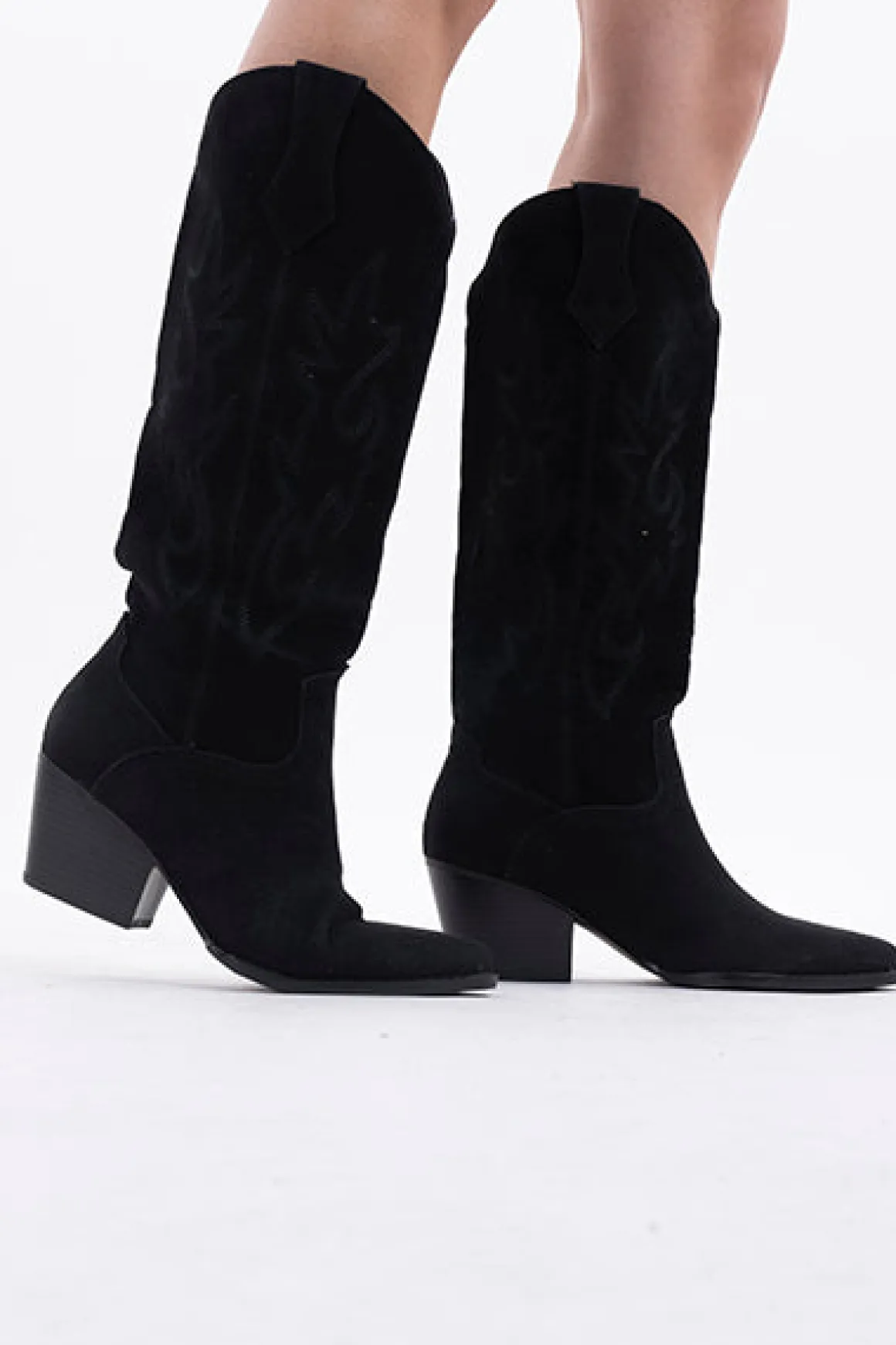 Botas vaqueras puntal con bordados decorativos y presillas laterales.