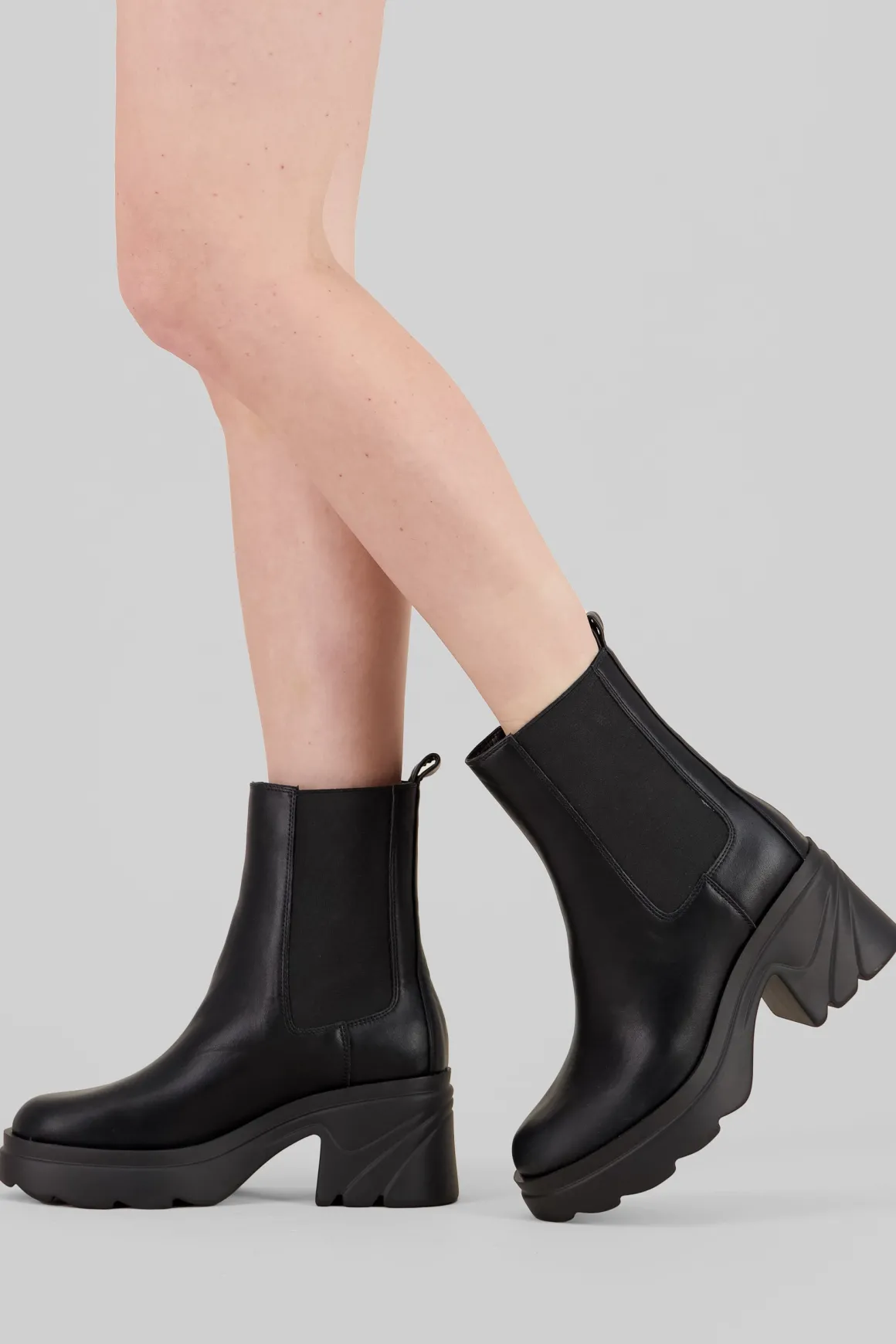 Descubre el botín chelsea en efecto piel con tacón grueso texturizado y plataforma dentada. Su diseño incluye elásticos en los laterales y tiradores traseros para brindarte comodidad y estilo a la vez.