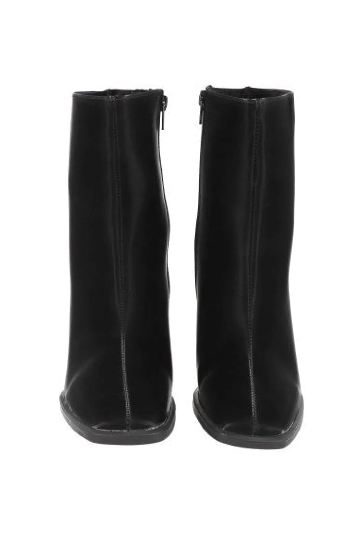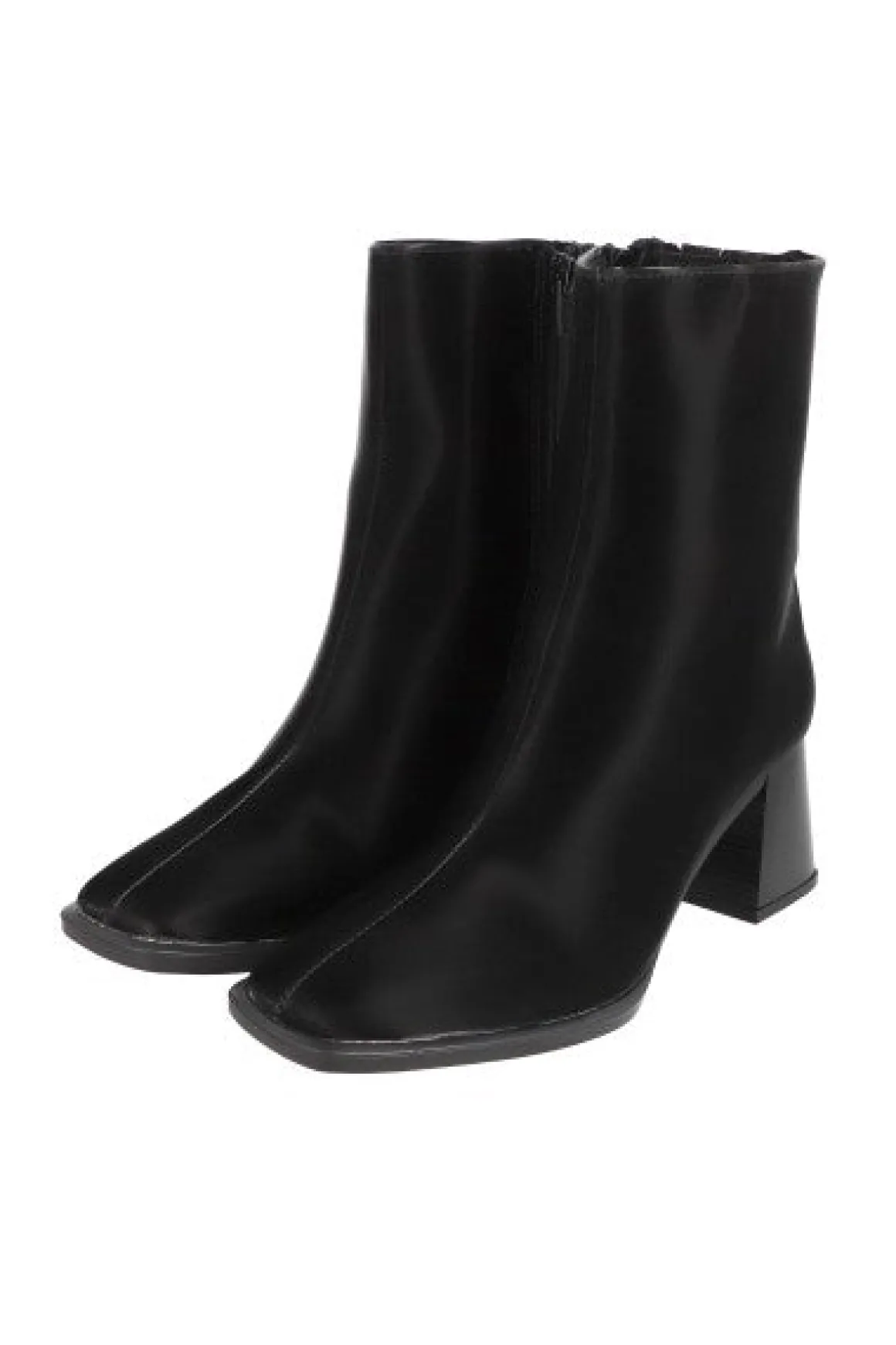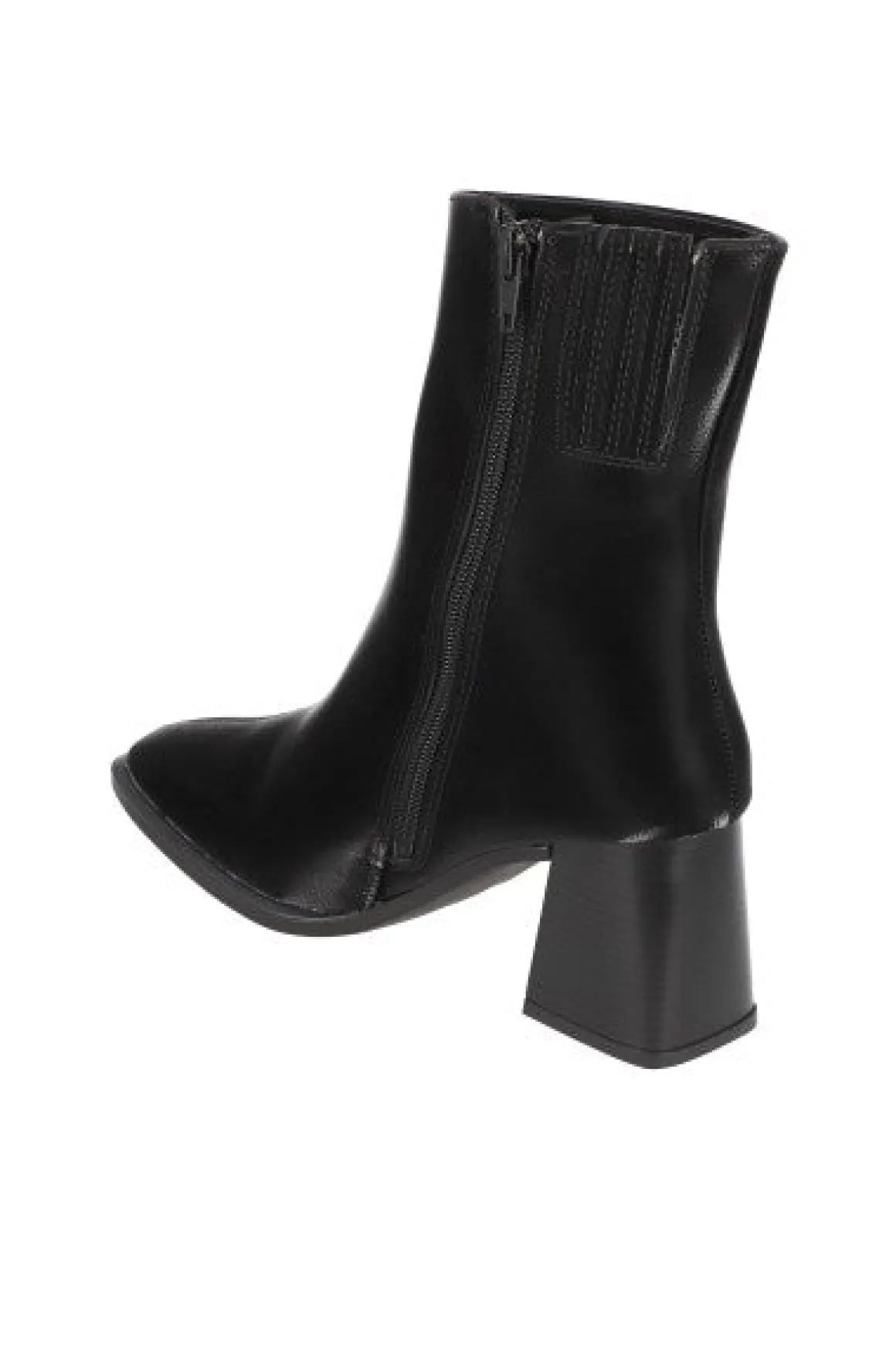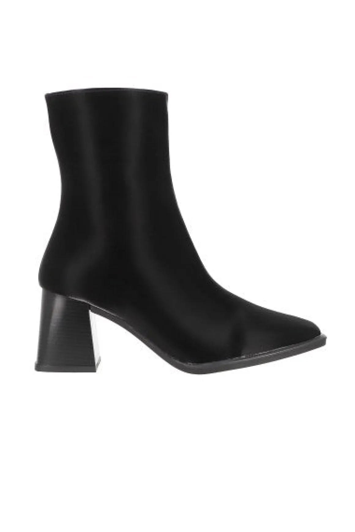 Botín midi de efecto piel liso. Tacón bloque bajo. Punta cuadrada y costura frontal. Cierre lateral.
