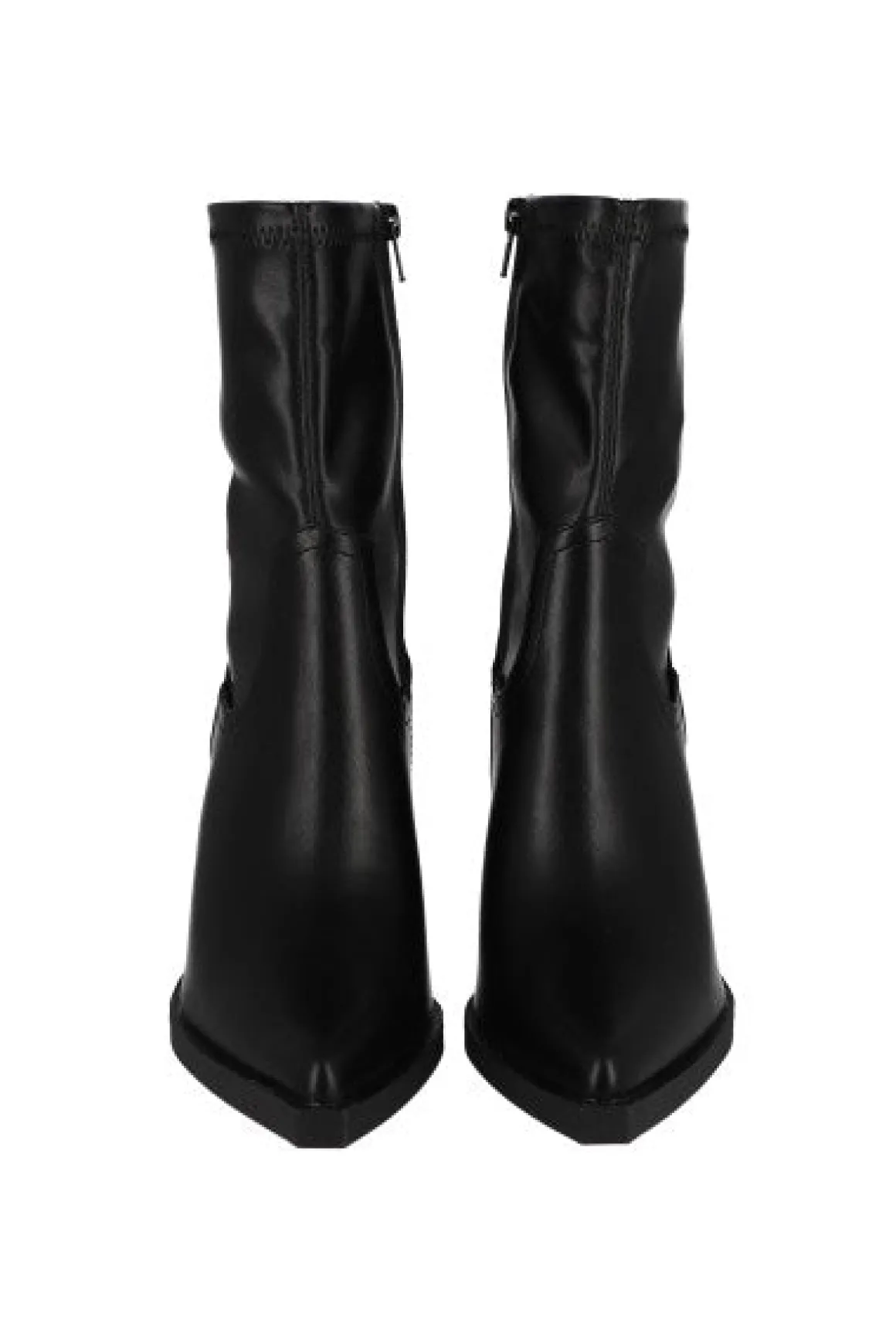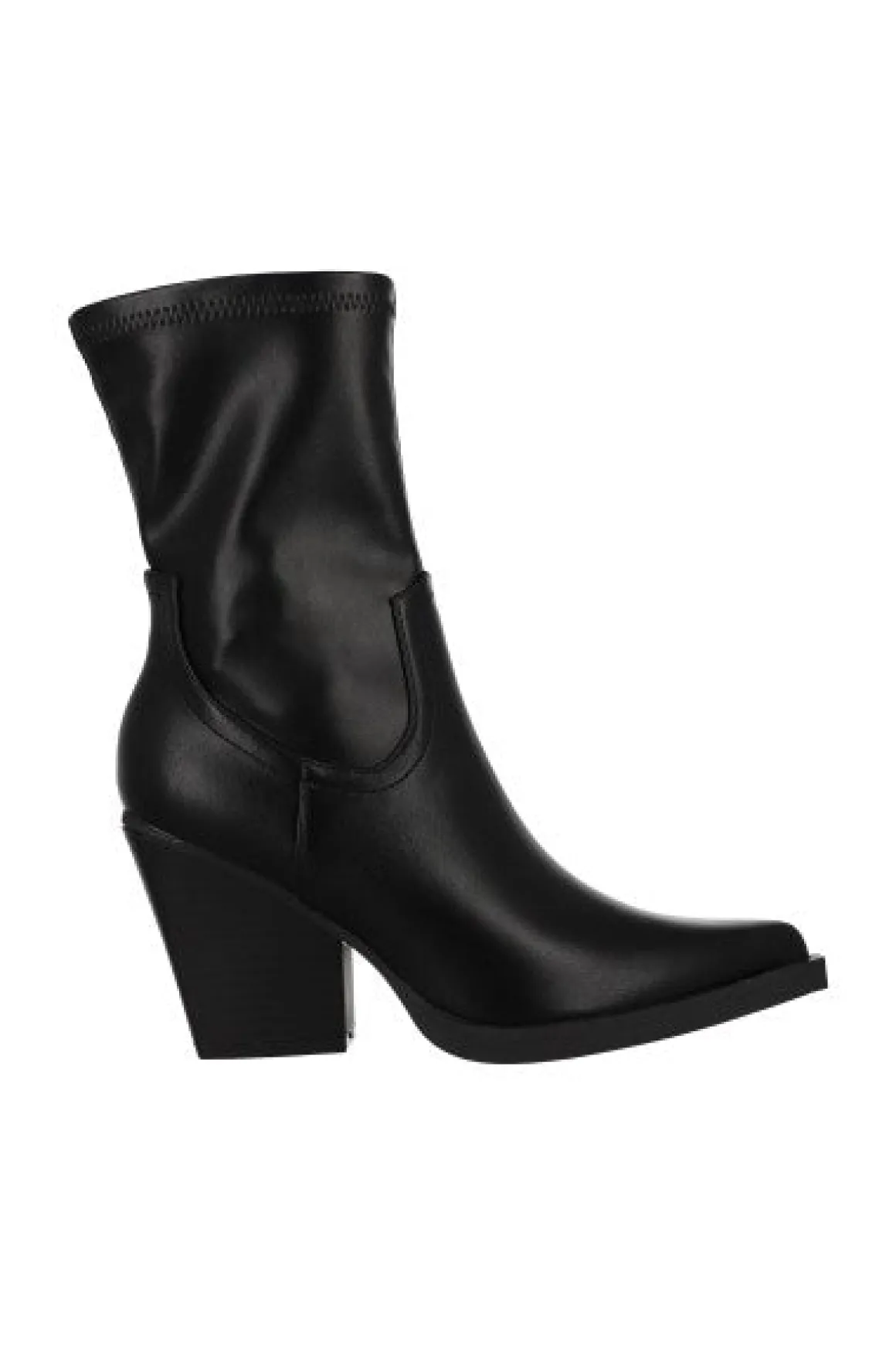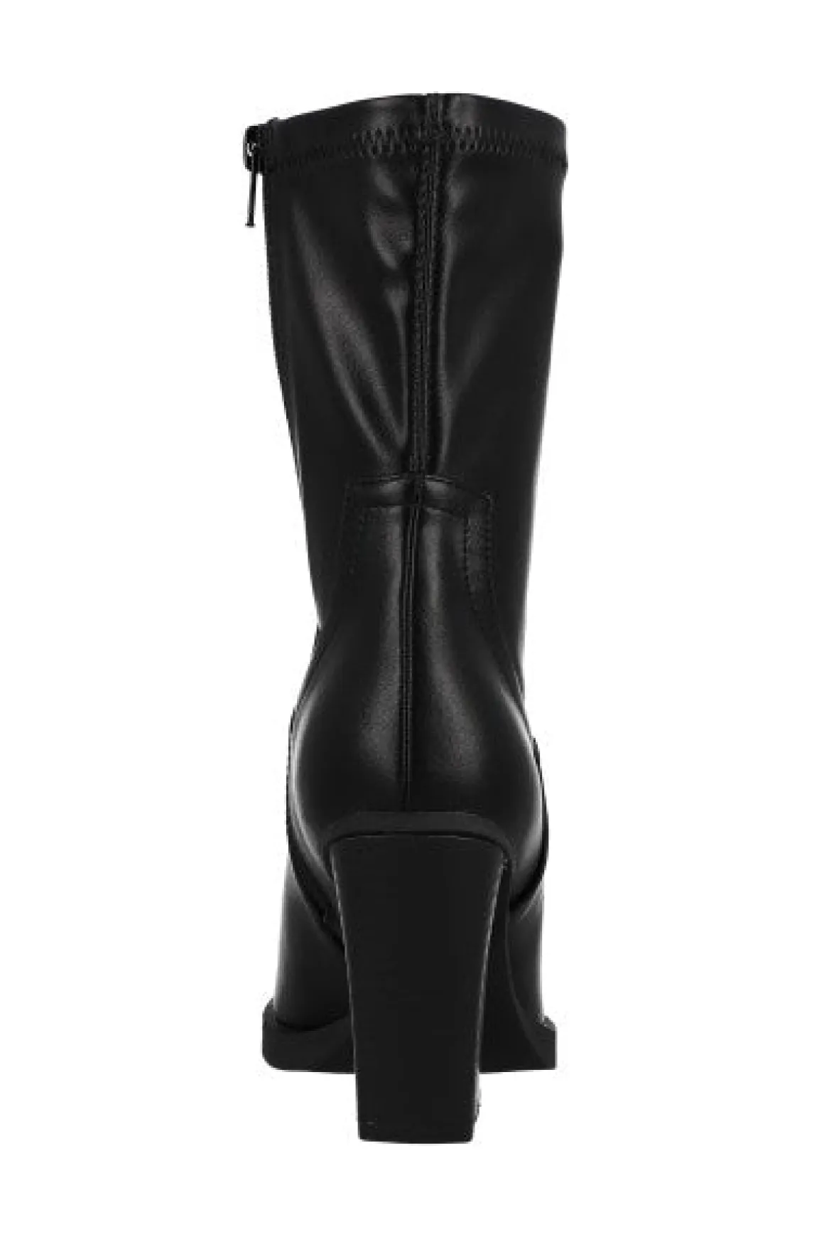 Este botín midi presenta un elegante efecto piel puntiagudo. Su tacón grueso bajo ofrece comodidad y estilo a la vez. Con cierres laterales para un ajuste seguro y sencillo.
