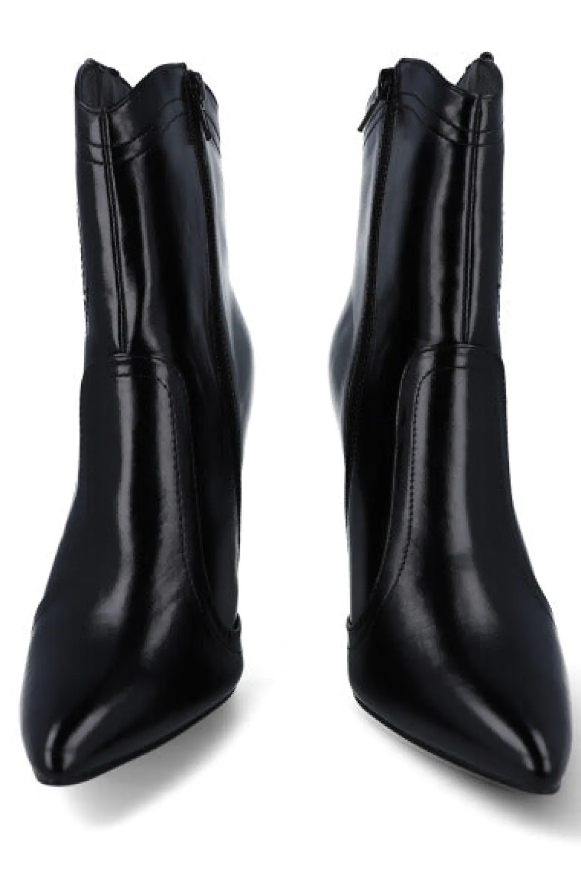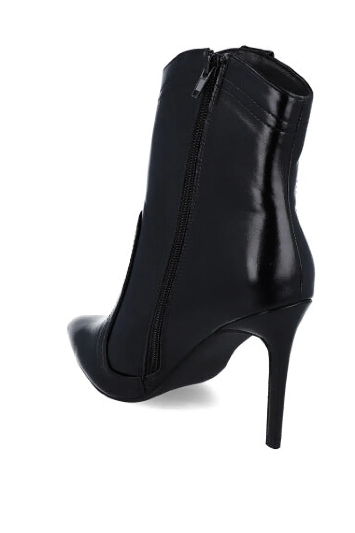 Botines con tacón delgado de efecto piel con diseños bordados. Cierre lateral mediante cremallera.