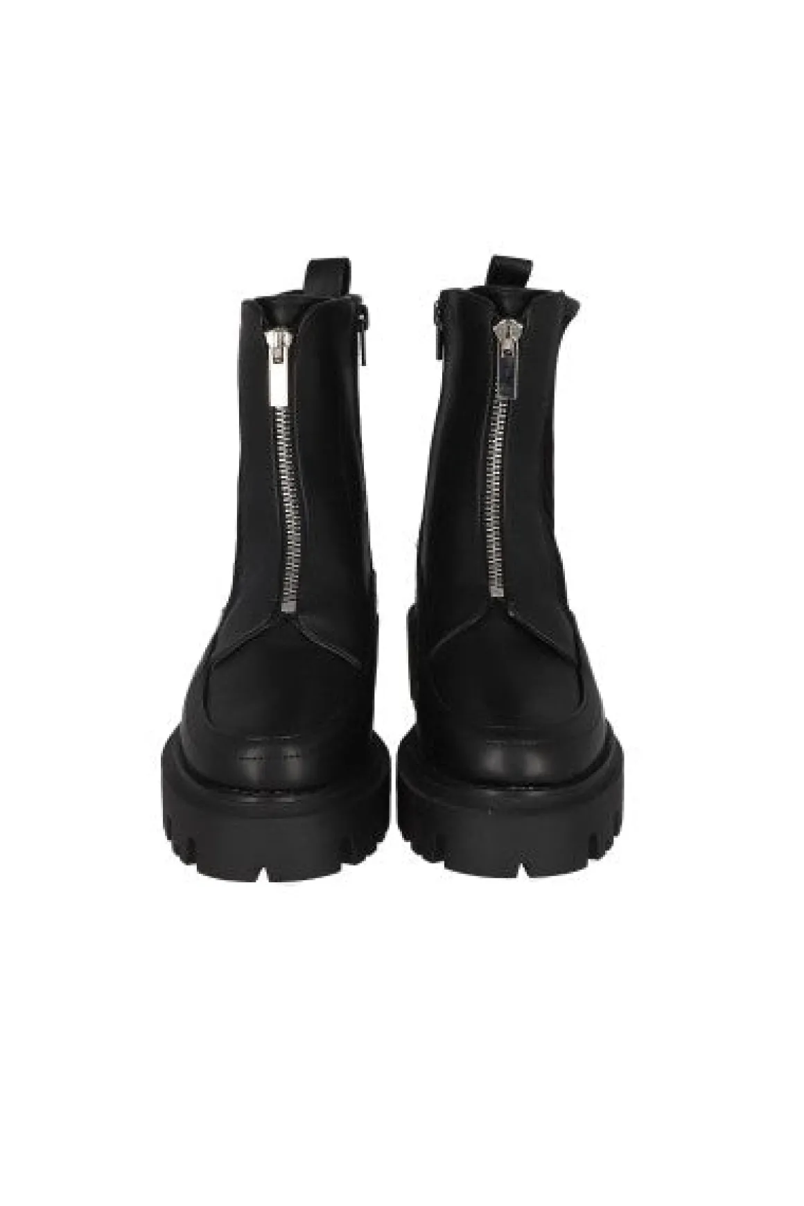 Botín en efecto piel con tubo tejido, cremallera metálica frontal y suela estilo track combinada a tono.