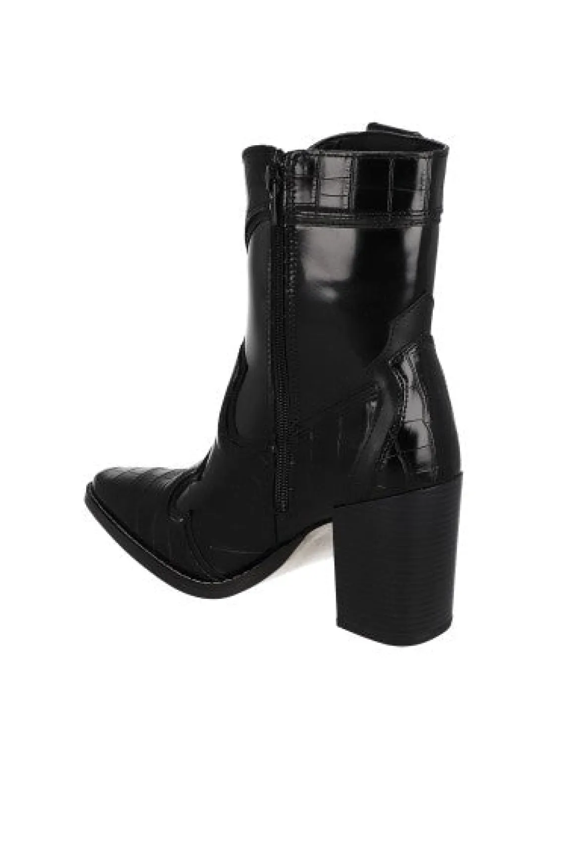 Botín midi vaquero de efecto piel. Tacón bloque alto. Diseño con textura croco. Tiradores laterales.