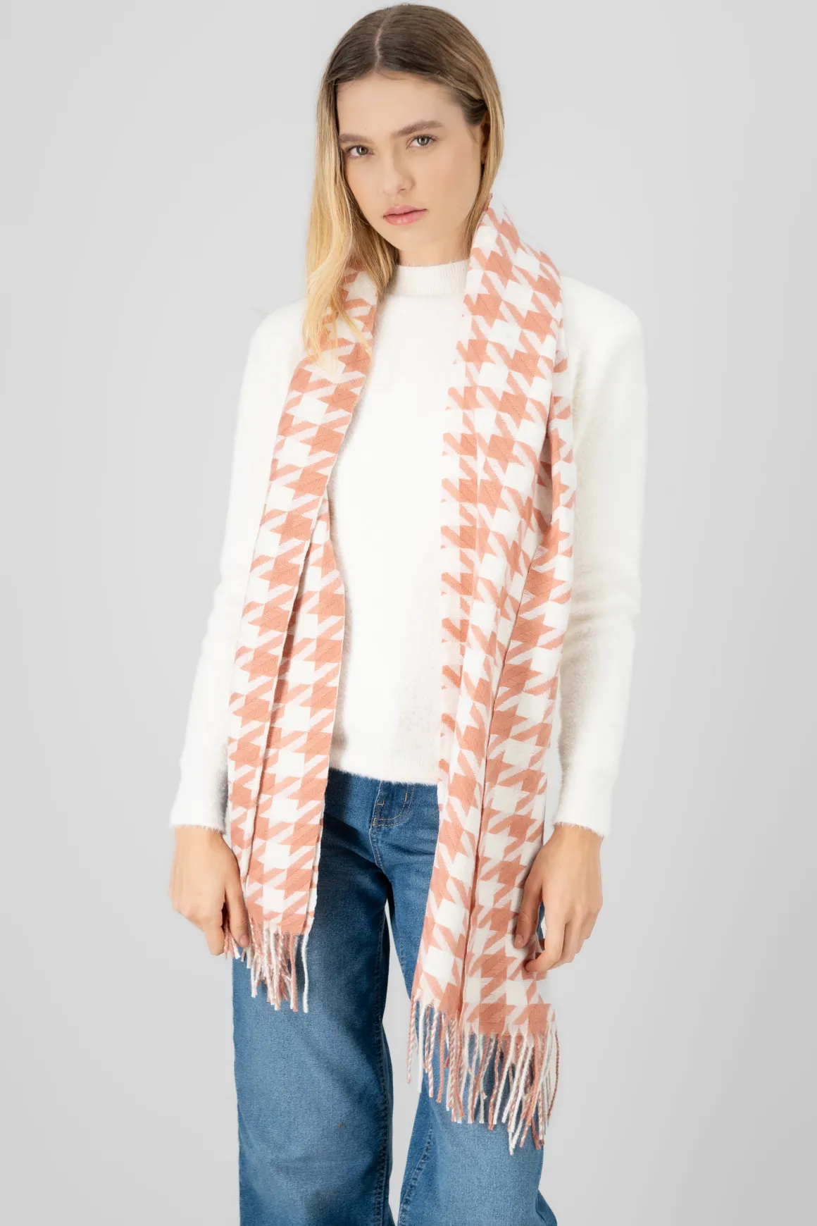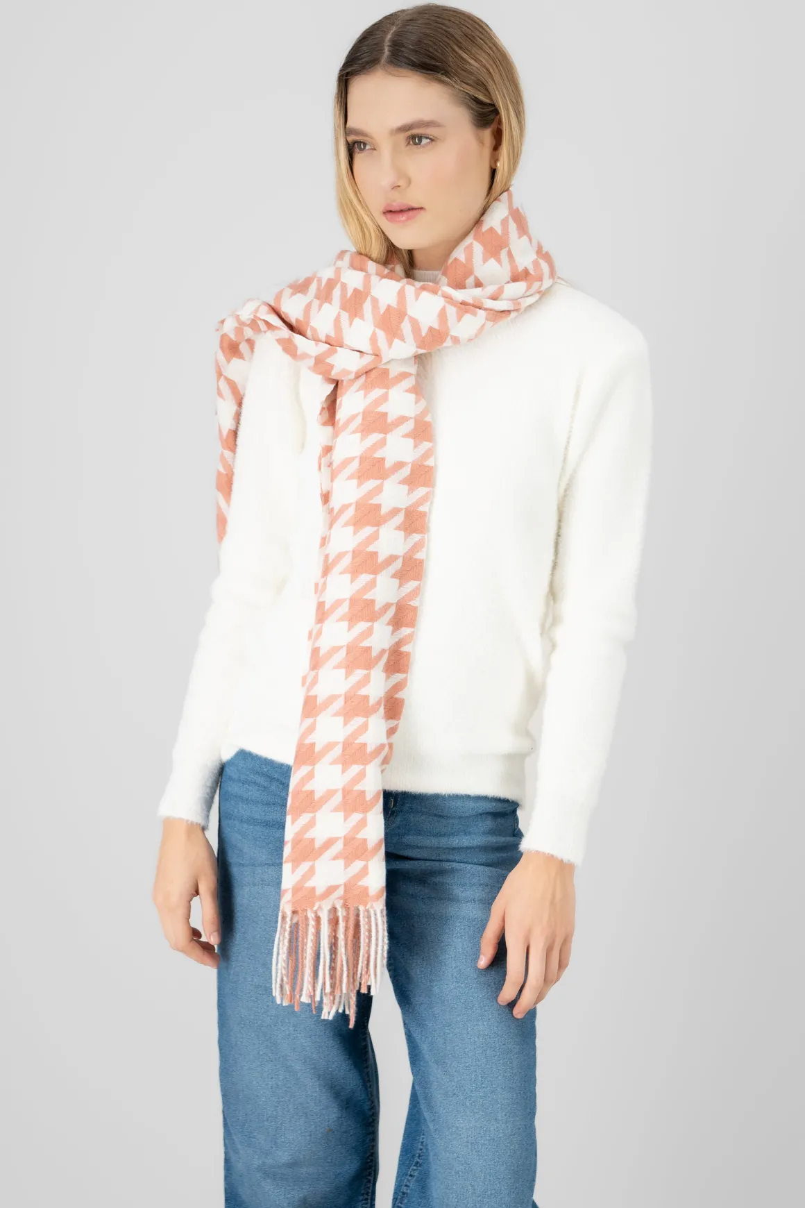 Esta bufanda con estampado de pata de gallo es un must-have para un look chic y moderno.