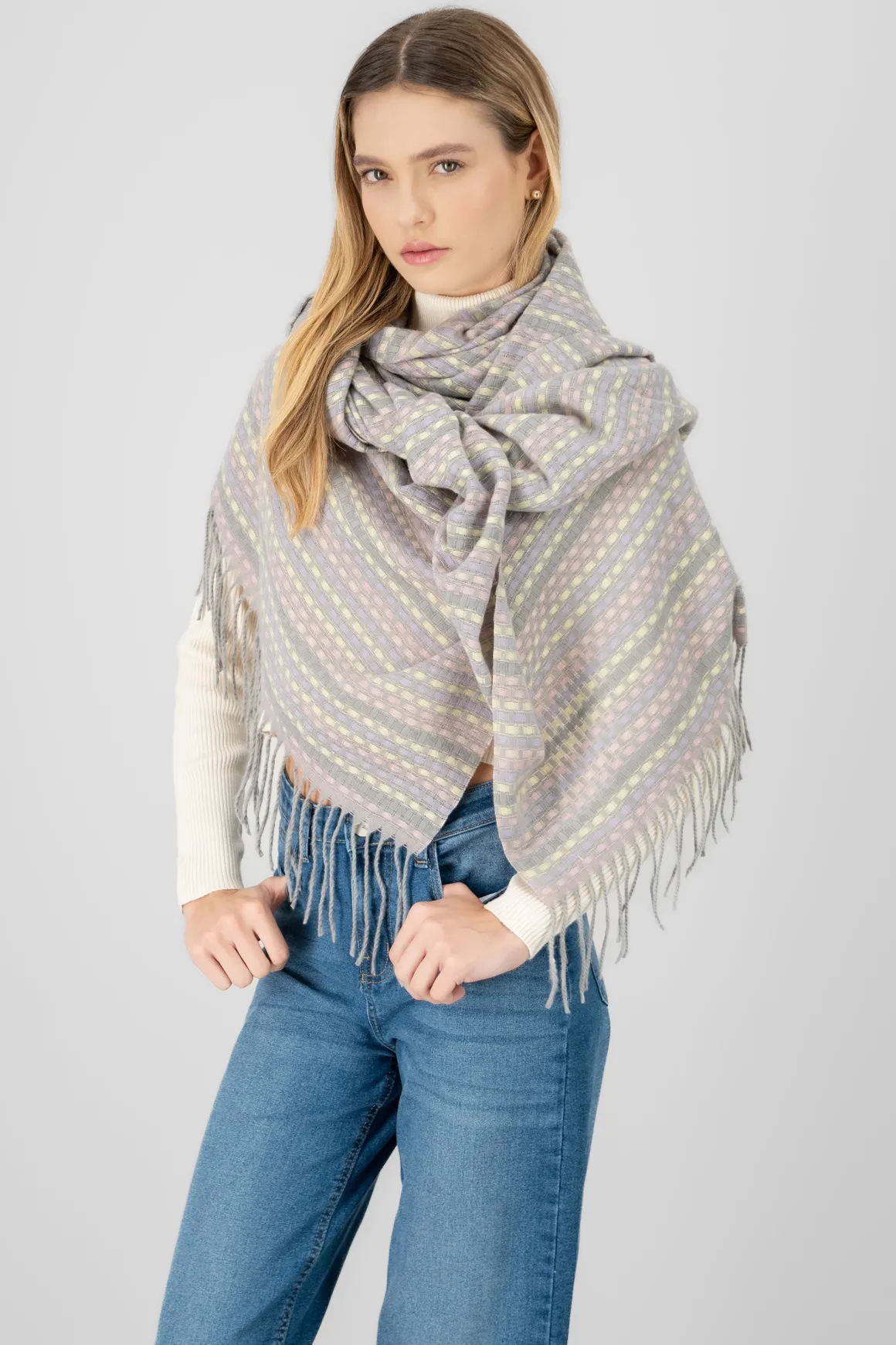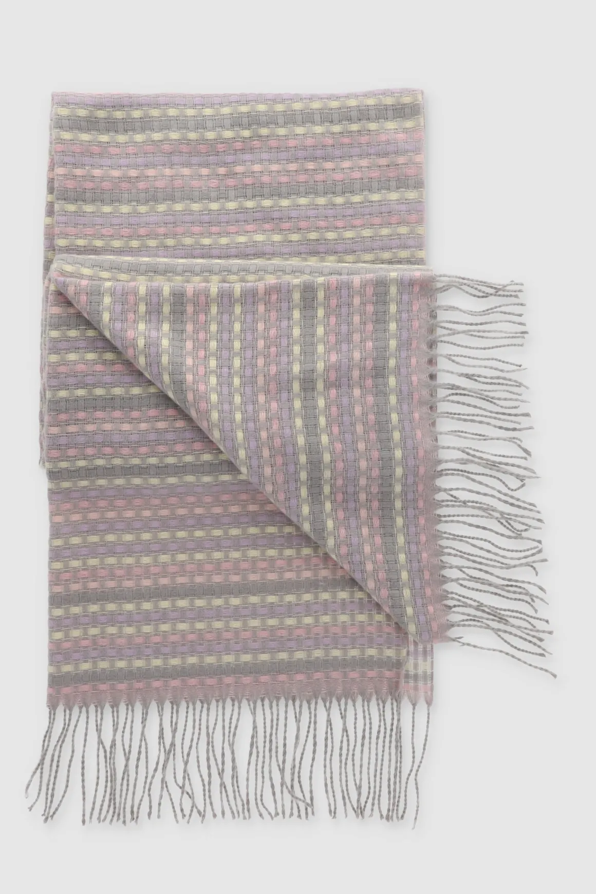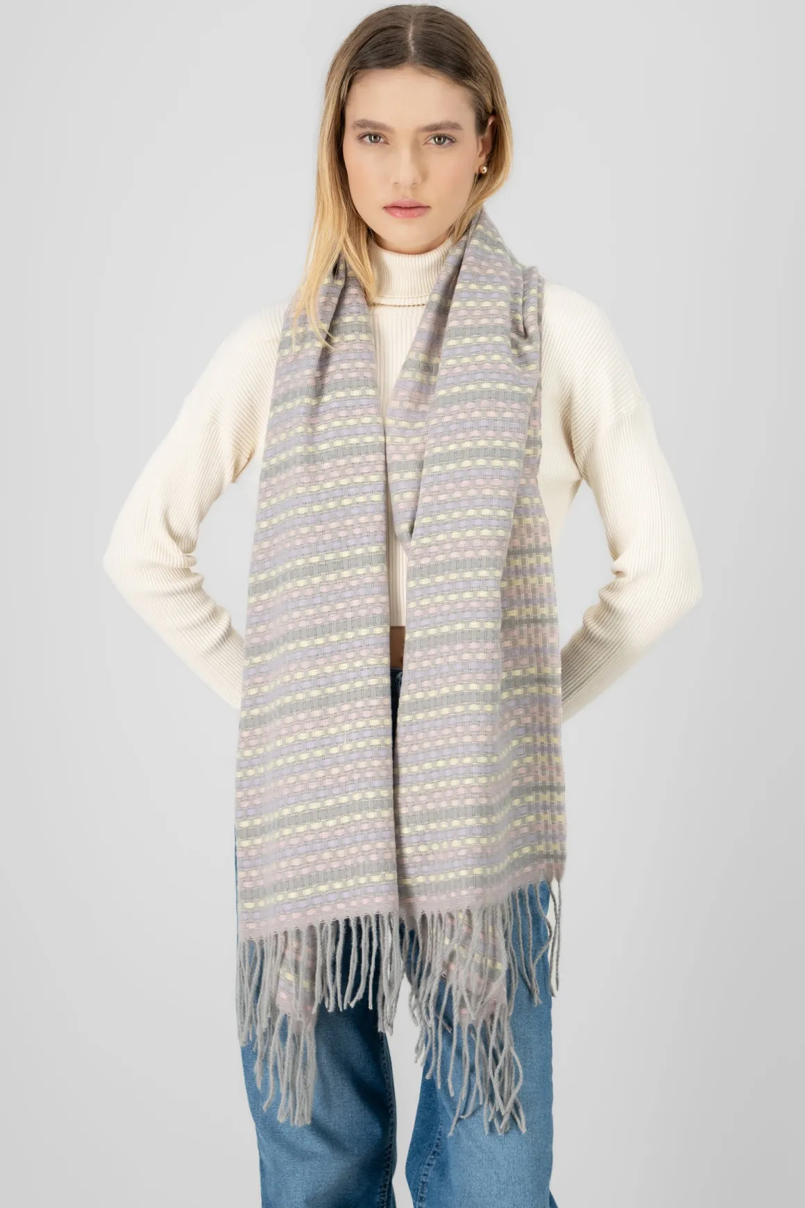 Bufanda con estampado rayas, acabado en flecos.