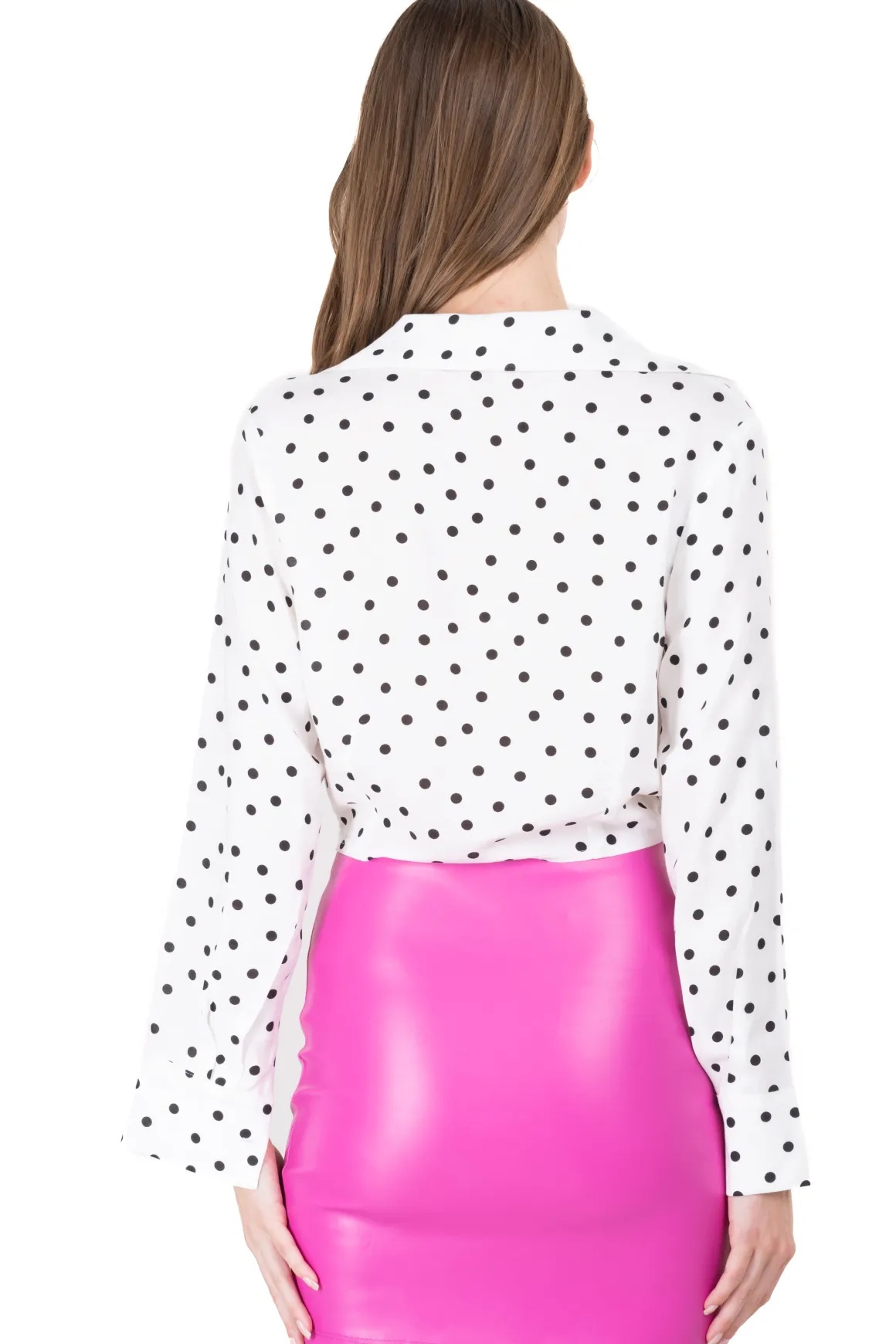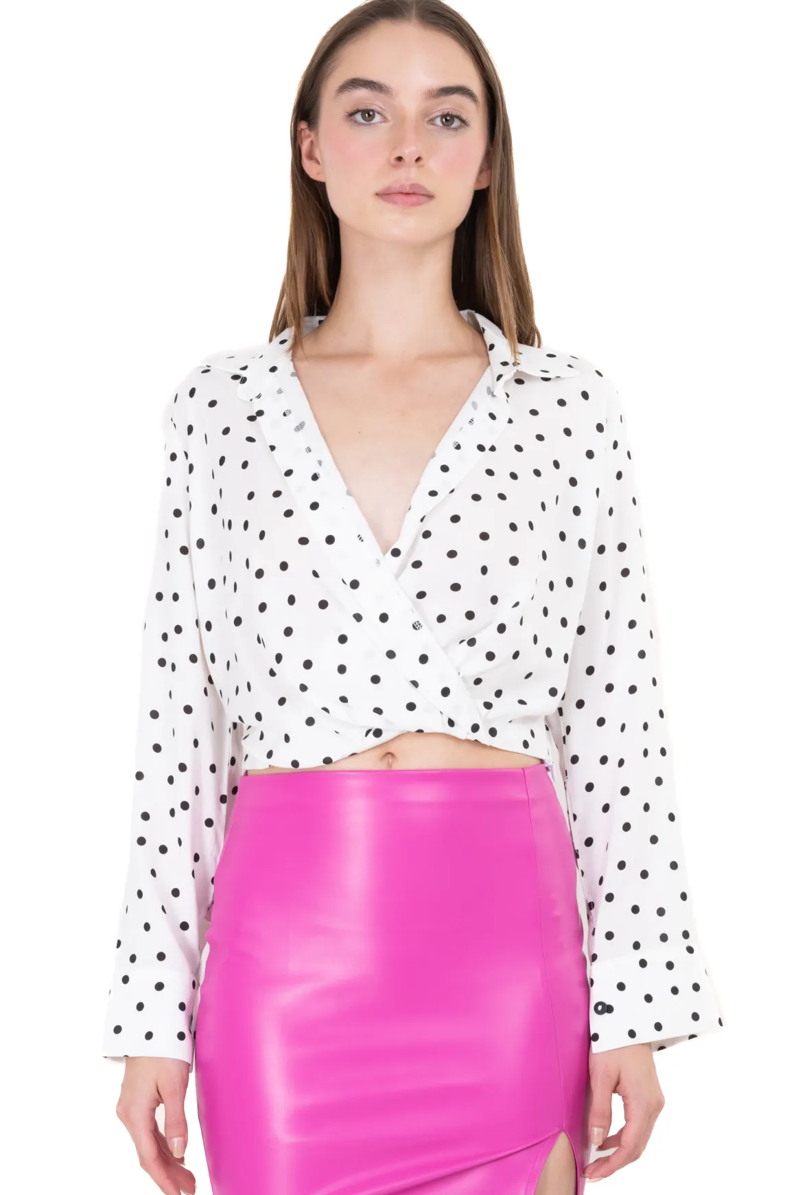 Camisa crop cruzada de manga larga con solapa en cuello y escote v profundo. Estampado de polka dots.