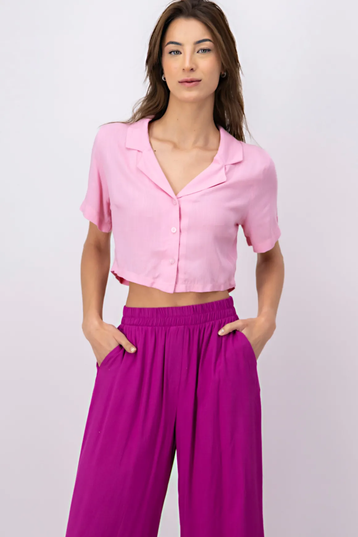Esta camisa crop es ideal para un look relajado pero moderno. Su diseño sencillo la hace perfecta para combinar con tus jeans o faldas favoritas.