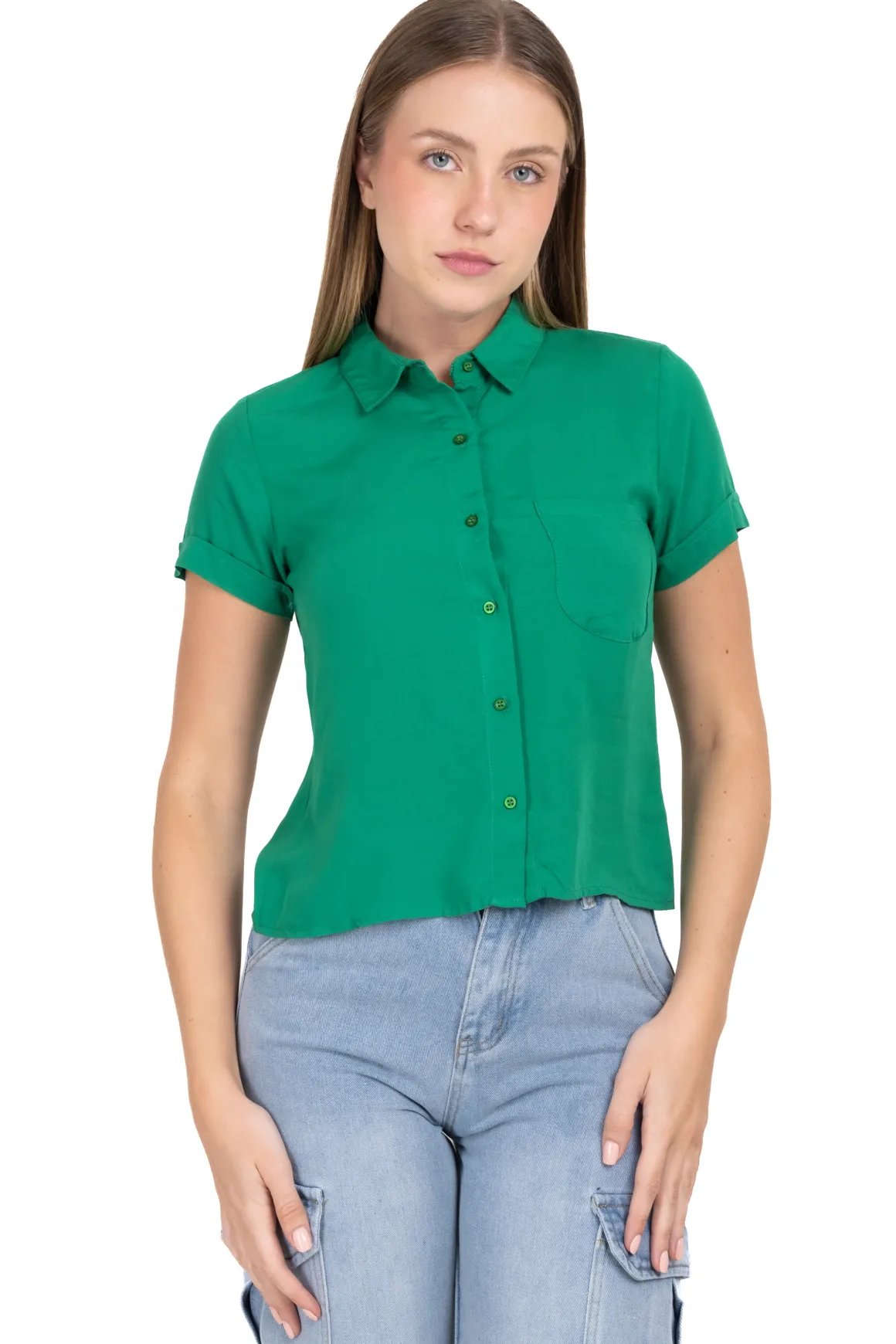 Camisa crop lisa de cuello solapa con manga corta y bolsillo en pecho. Cierre frontal con botones combinados a tono.