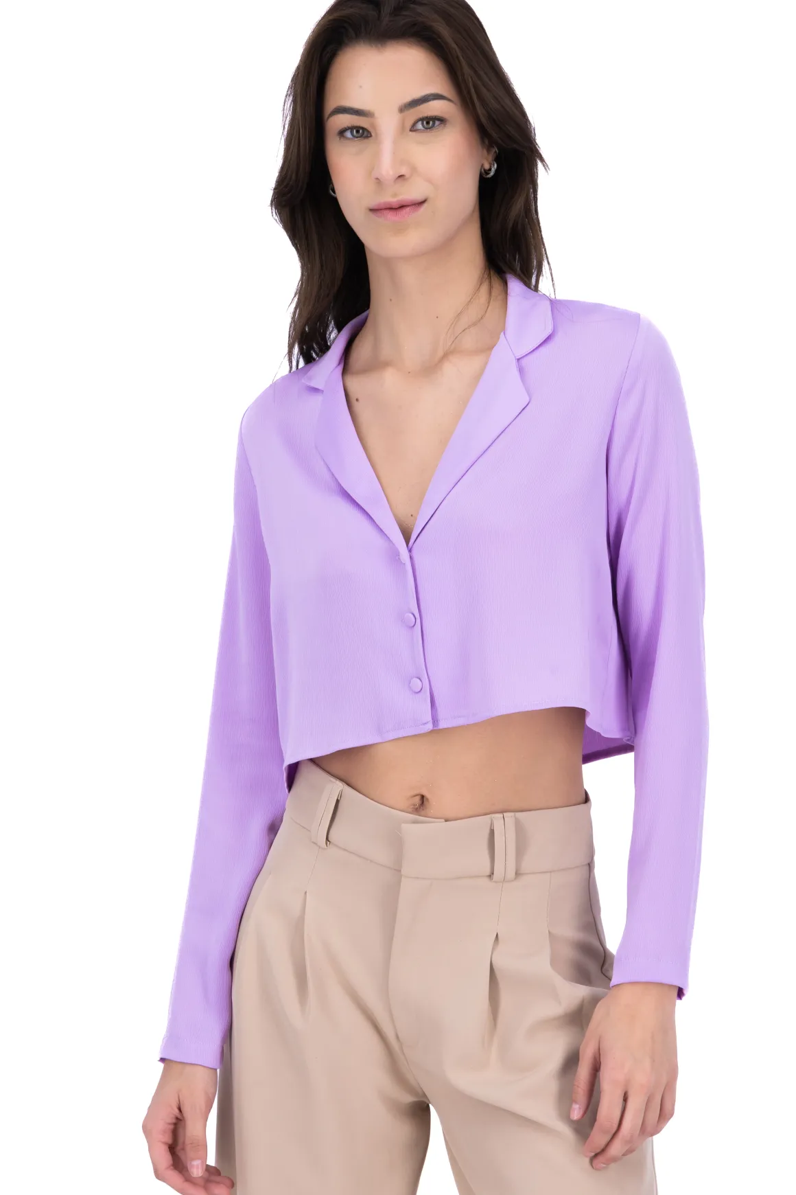 La camisa crop manga larga es una prenda versátil que puedes lucir en cualquier ocasión. Su tejido plano con textura y su corte crop le dan un toque moderno y elegante a tu estilo. Con escote en V y cuello regular, esta camisa es perfecta para destacar tu figura. El cierre frontal mediante botones forrados le agrega un detalle sofisticado.