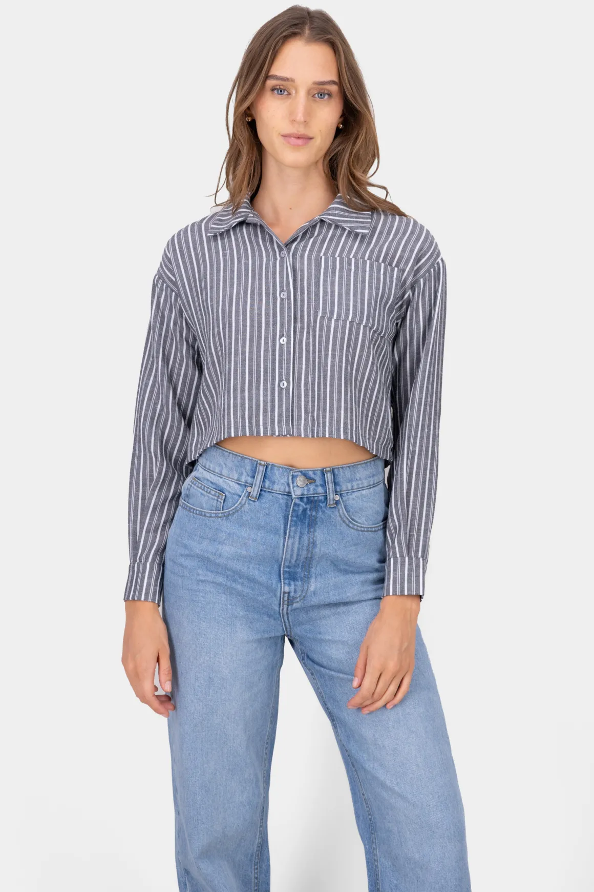 Descubre nuestra camisa crop con diseño de rayas a contraste, perfecta para un estilo casual y fresco: