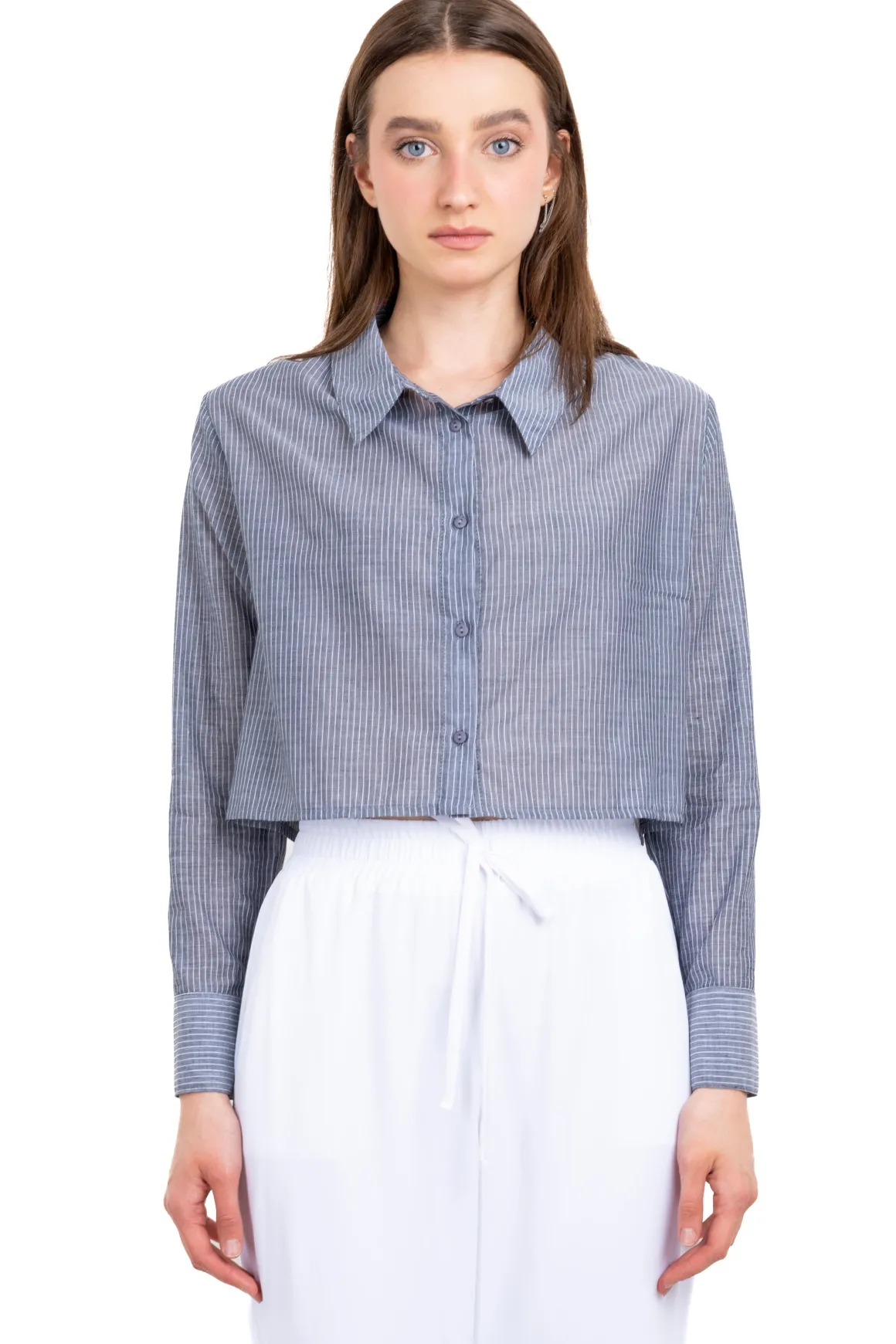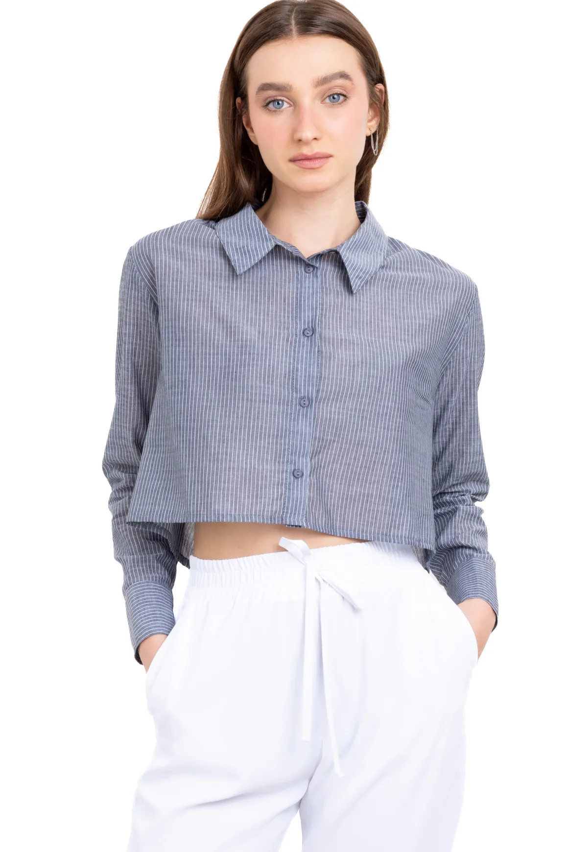 Camisa crop rayada de cuello regular con mangas largas. Botones con ojal en la parte frontal.