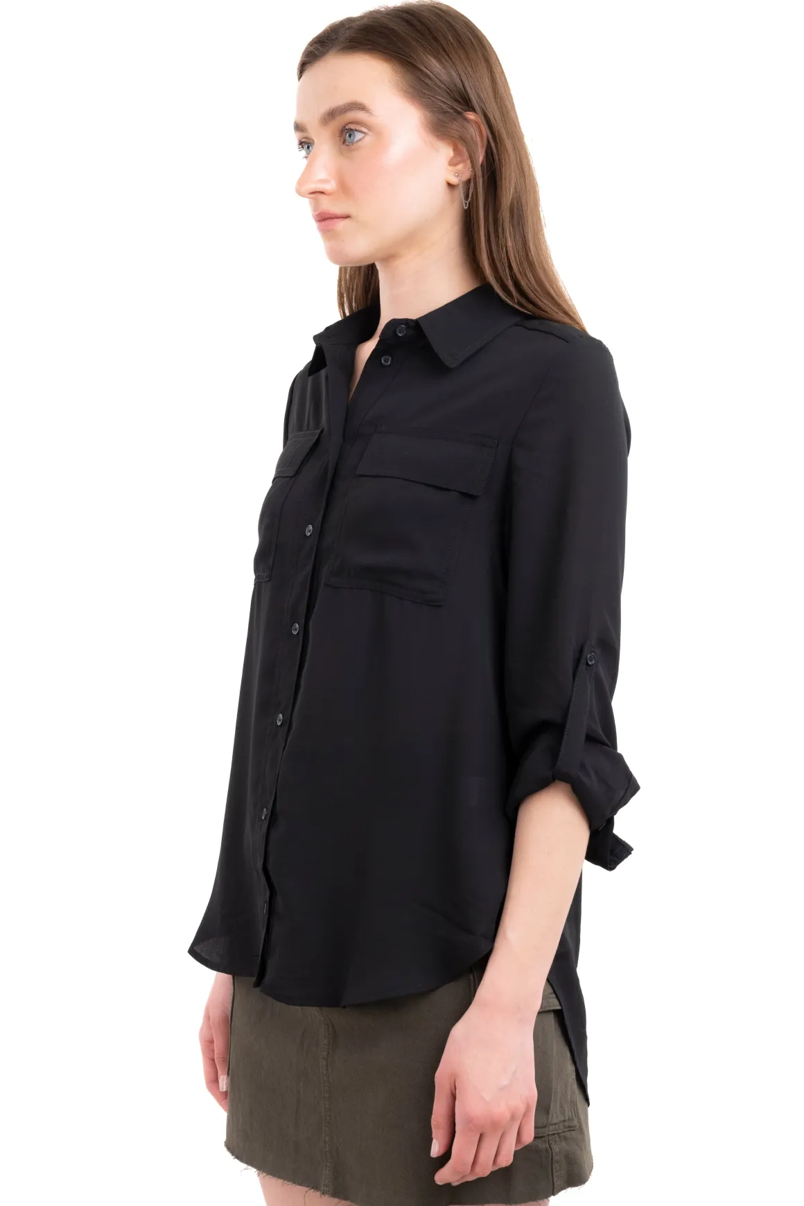 Camisa ligera de cuello solapa con bolsos en pecho y pinzas plisadas en espalda. Manga larga con elevadores. Cierre frontal con botones combinados a tono.