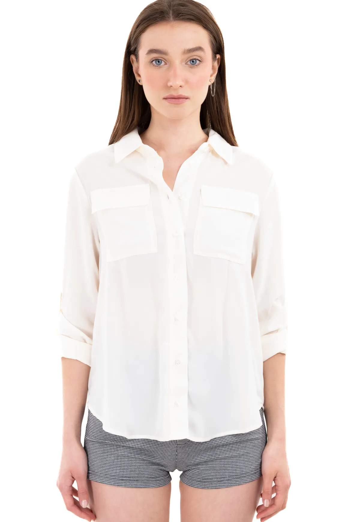 Camisa ligera de cuello solapa con bolsos en pecho y pinzas plisadas en espalda. Manga larga con elevadores. Cierre frontal con botones combinados a tono.