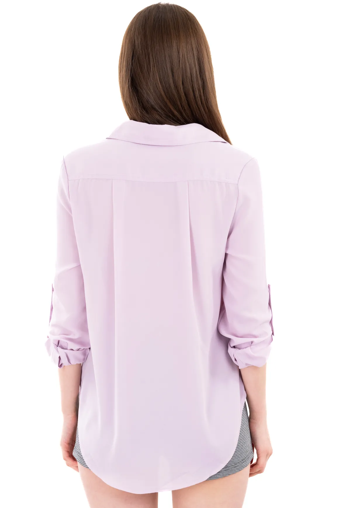 Camisa ligera de cuello solapa con bolsos en pecho y pinzas plisadas en espalda. Manga larga con elevadores. Cierre frontal con botones combinados a tono.