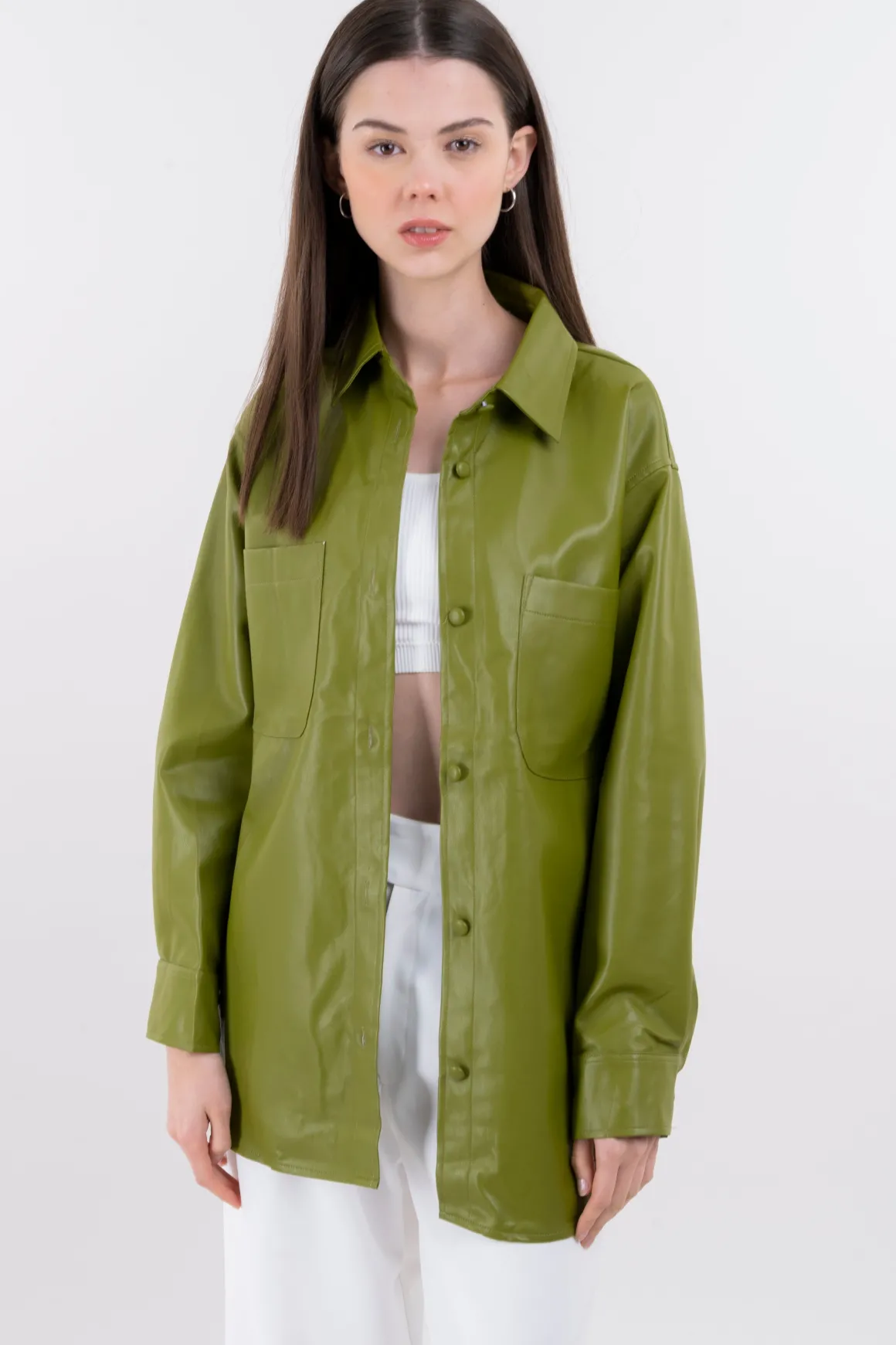 Camisa oversize efecto piel con manga larga. Bolsillos de solapa y botones con ojal frontales.