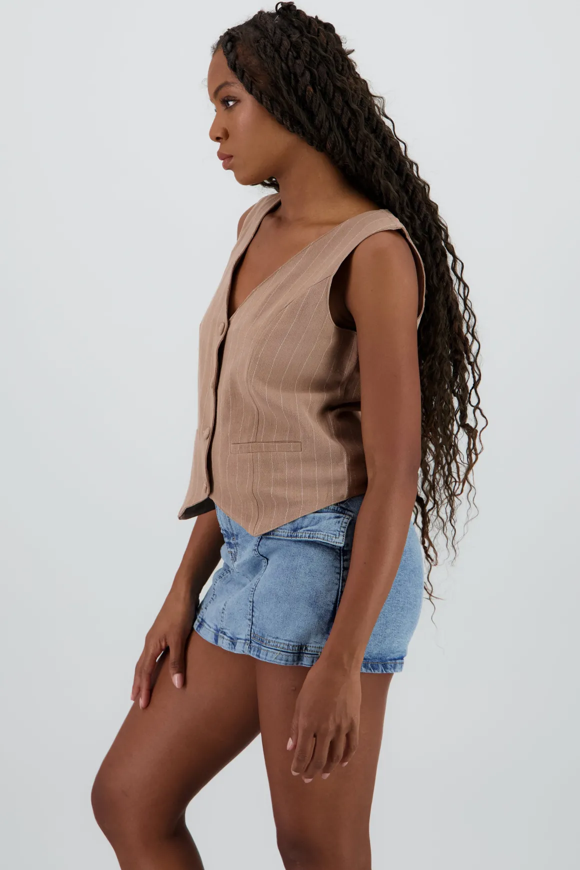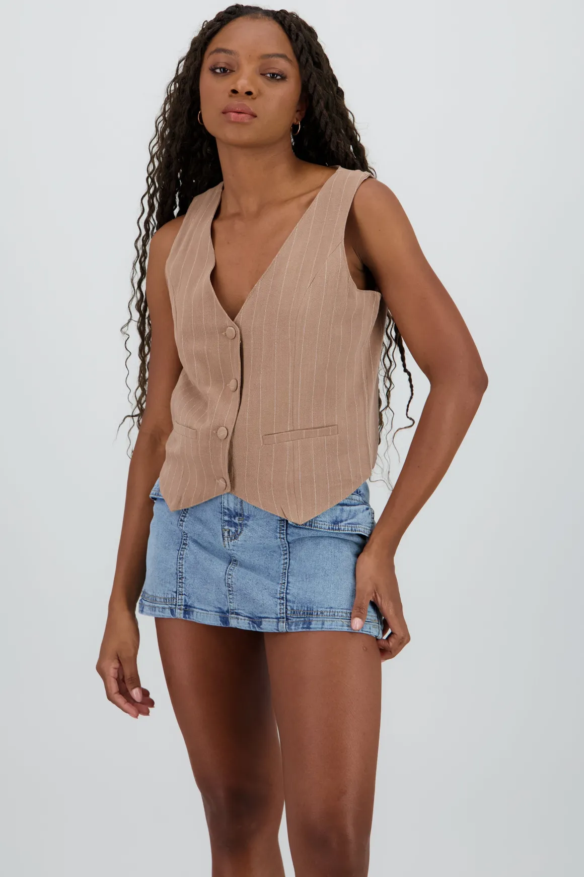 Este chaleco es perfecto para darle un giro a tu look con un toque relajado pero lleno de estilo. Su diseño de rayas lo hace fácil de combinar y añadir a cualquier outfit.