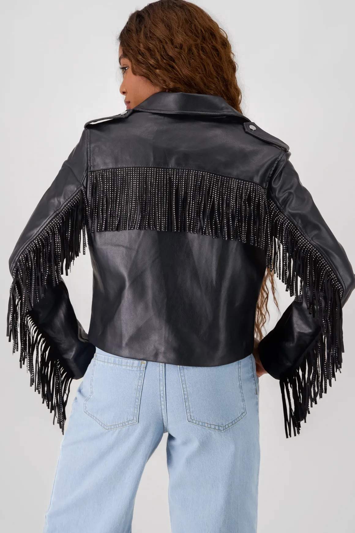 Desata tu lado más audaz con esta chamarra biker de efecto piel, diseñada para destacar a donde vayas. Su cierre cruzado le da un aire rebelde, mientras que los flecos con brillos añaden un toque de movimiento y brillo que no pasará desapercibido. Esta biker es perfecta para quienes buscan añadir personalidad y actitud a su look, haciéndola la pieza ideal para tus noches más atrevidas. ¡Atrévete a llevarla y conviértete en el centro de todas las miradas!