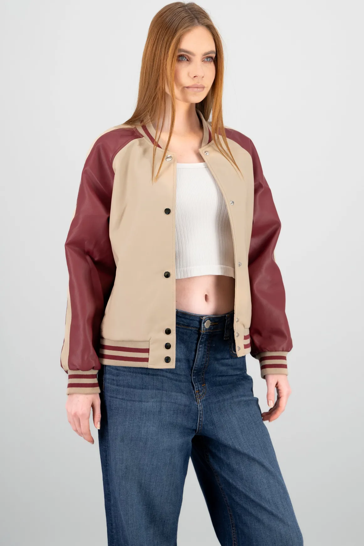 Chamarra bomber estilo varsity efecto piel: Esta chamarra bomber estilo varsity con efecto piel es perfecta para un look urbano y cool.
