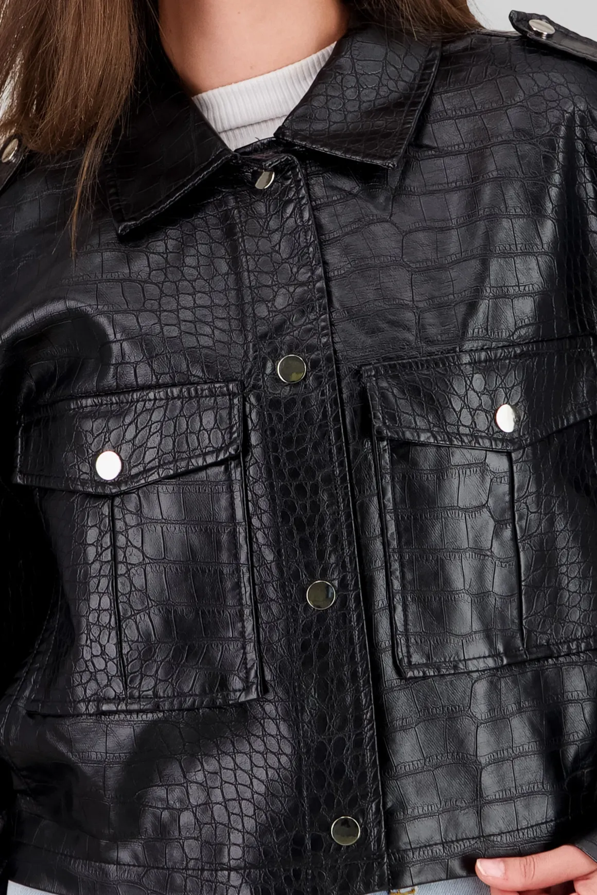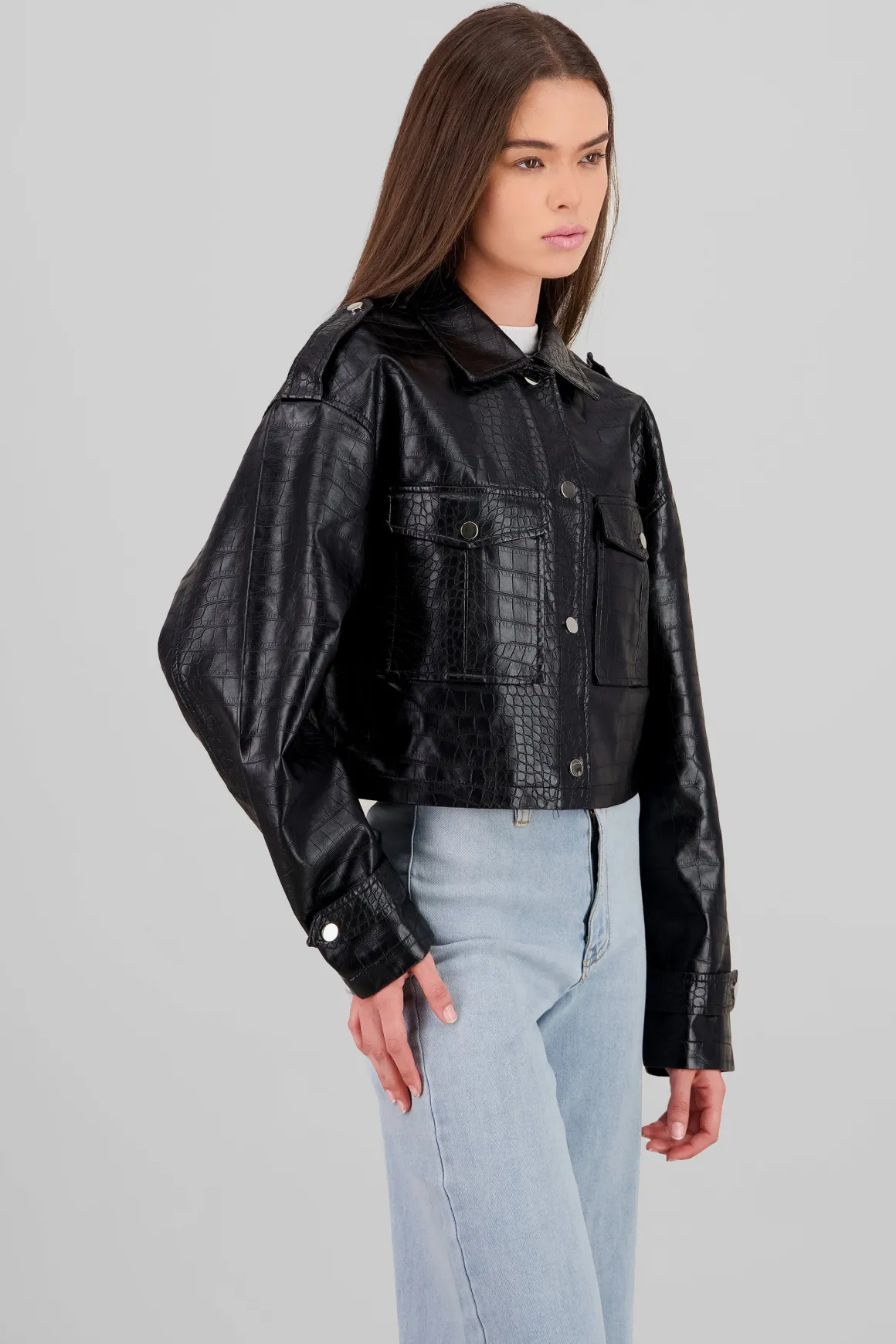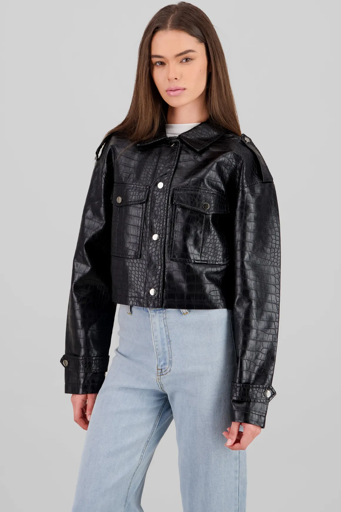 ¡Atrévete a marcar la diferencia con esta única chamarra! Con su llamativa textura de serpiente, es el complemento ideal para cualquier outfit. Ya sea que la combines con jeans o un vestido, esta pieza será el centro de atención.