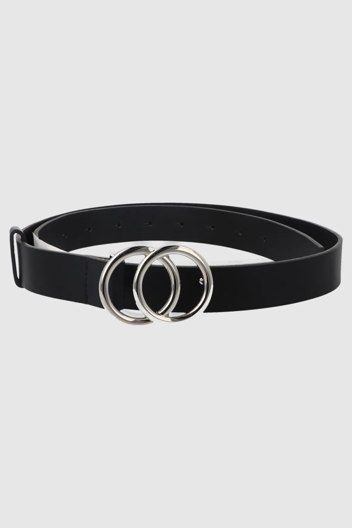 - Hebilla de dos aros entrelazados en acabado metálico que aporta un toque moderno y distintivo.