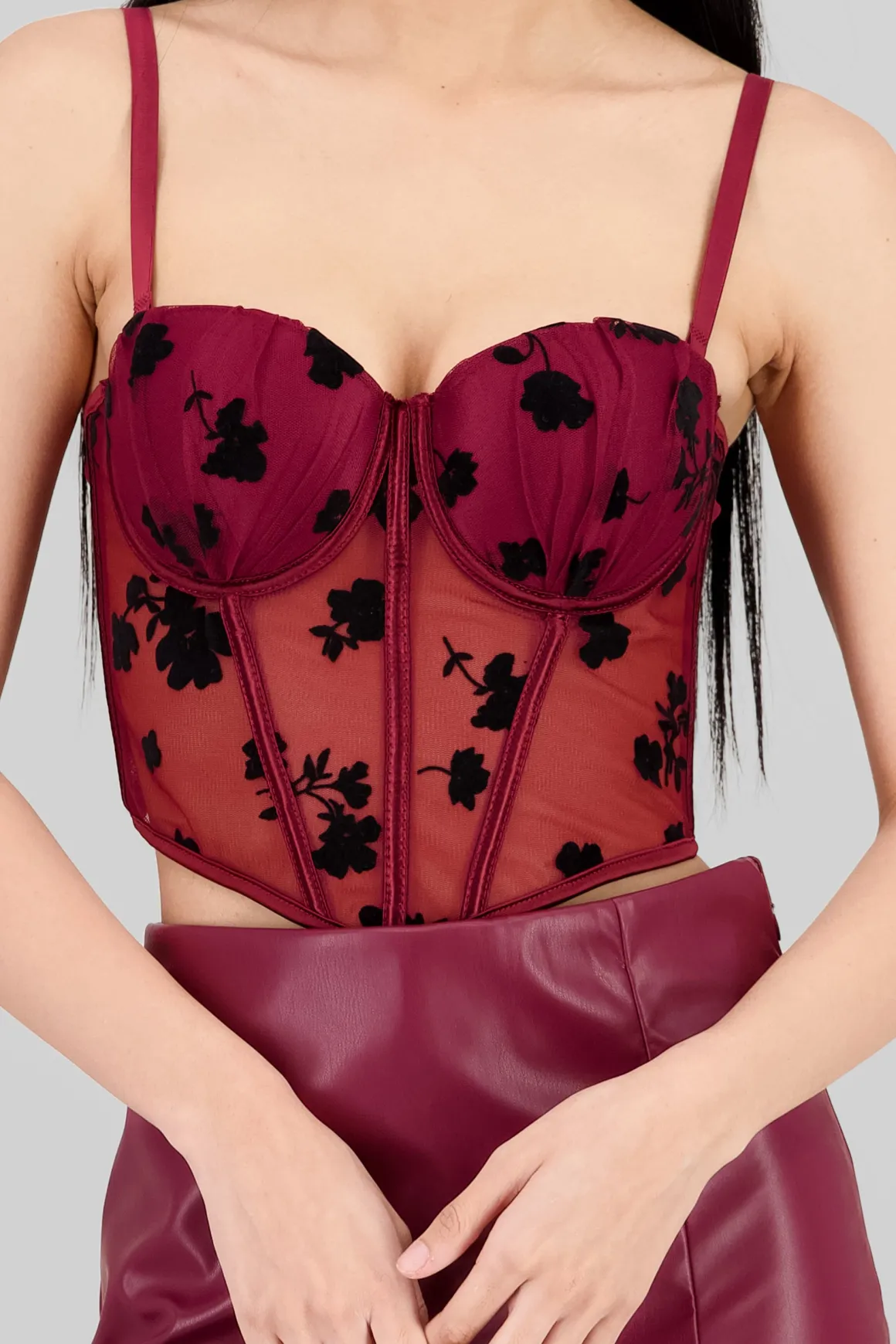 Un corset con diseño floral en flock que le da un toque romántico. Perfecto para combinar con jeans o faldas.