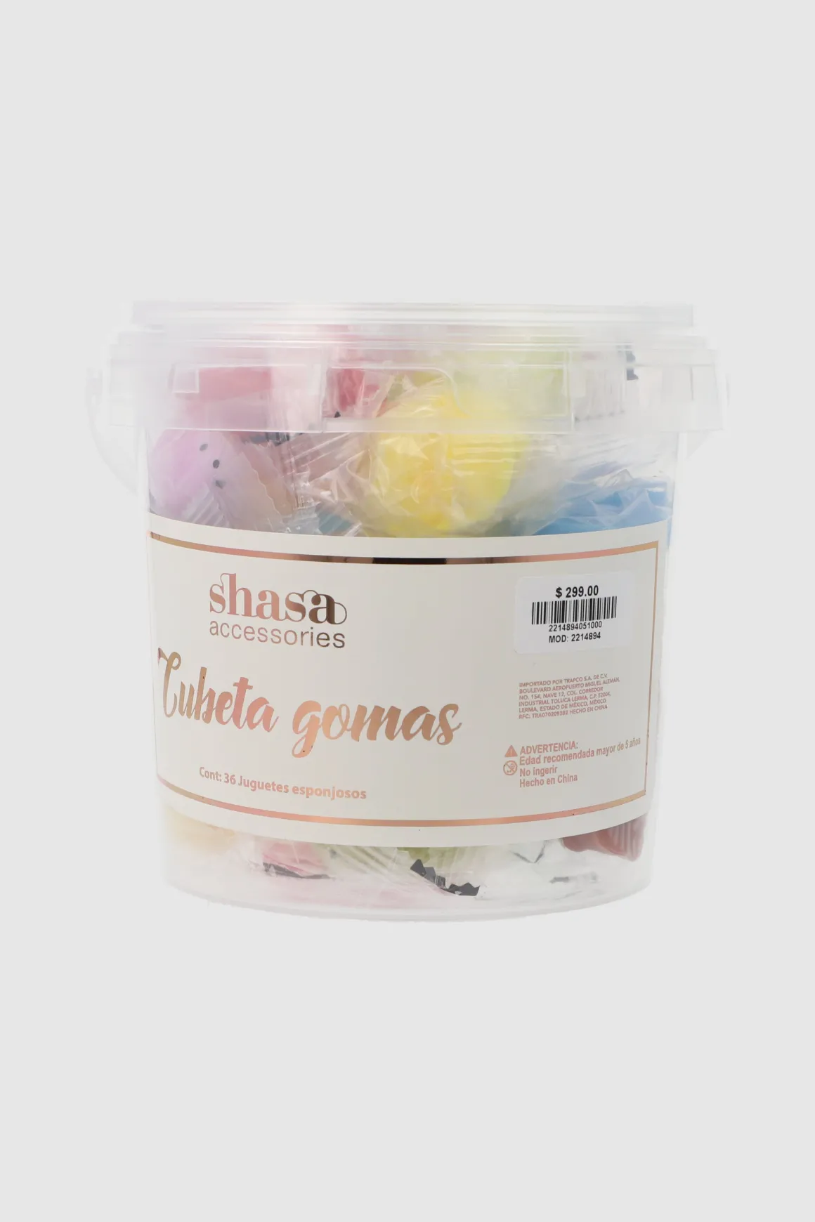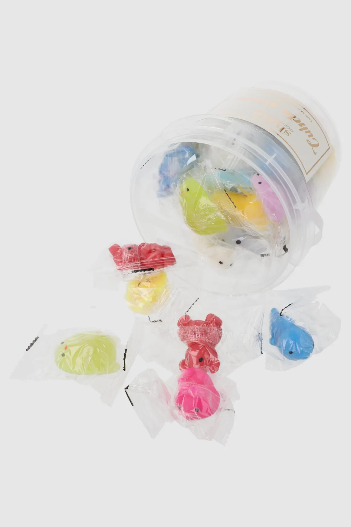 Cubeta con set de 36 squishys de figuritas, en varios colores, de material suave y elástico. Agrega emoción y color a las actividades de los niños con este juguete.