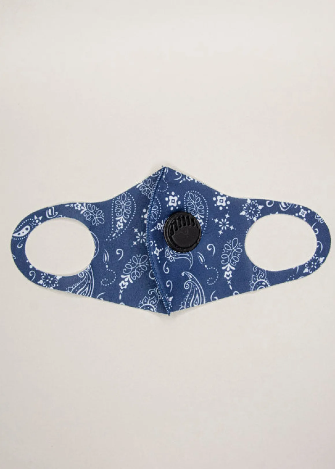 Cubreboca de neopreno en corte láser con válvula de filtro. Flexible y lavable con estampado paisley