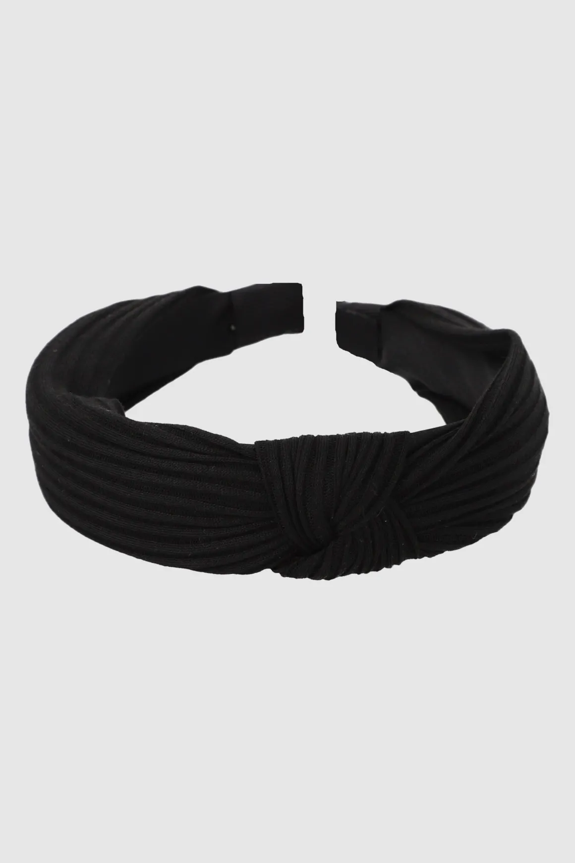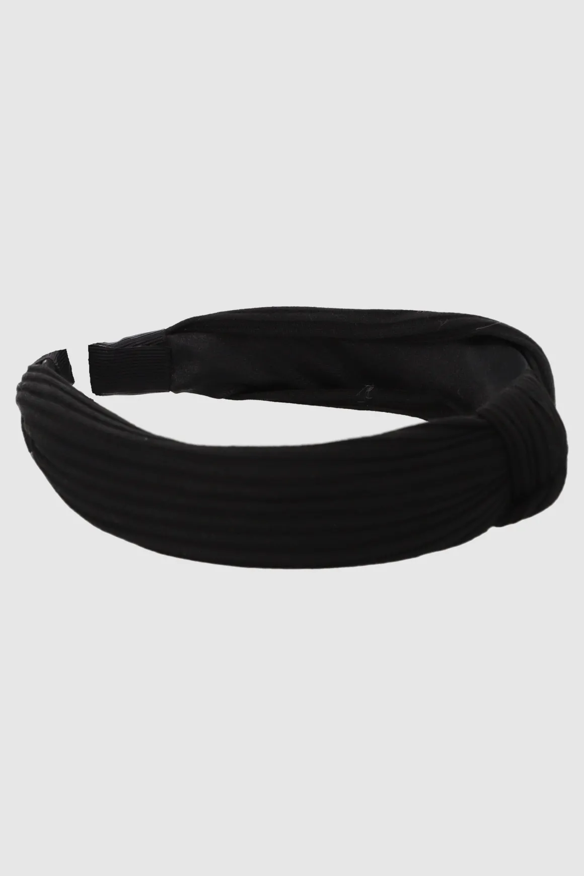 Diadema ancha rígida en forro de tela con nudo trenzado al centro.