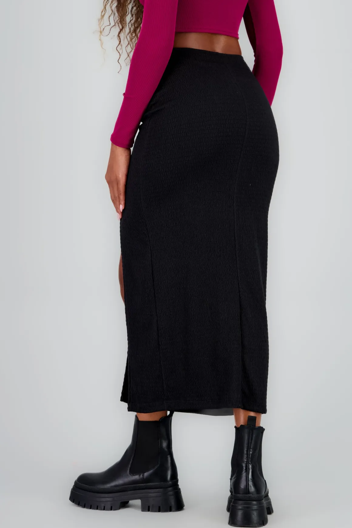 Esta falda midi es una pieza clave que no puede faltar en tu guardarropa. Perfecta para cualquier ocasión, su diseño con abertura le da un giro dinámico que la hace ideal para combinar con tus prendas favoritas.