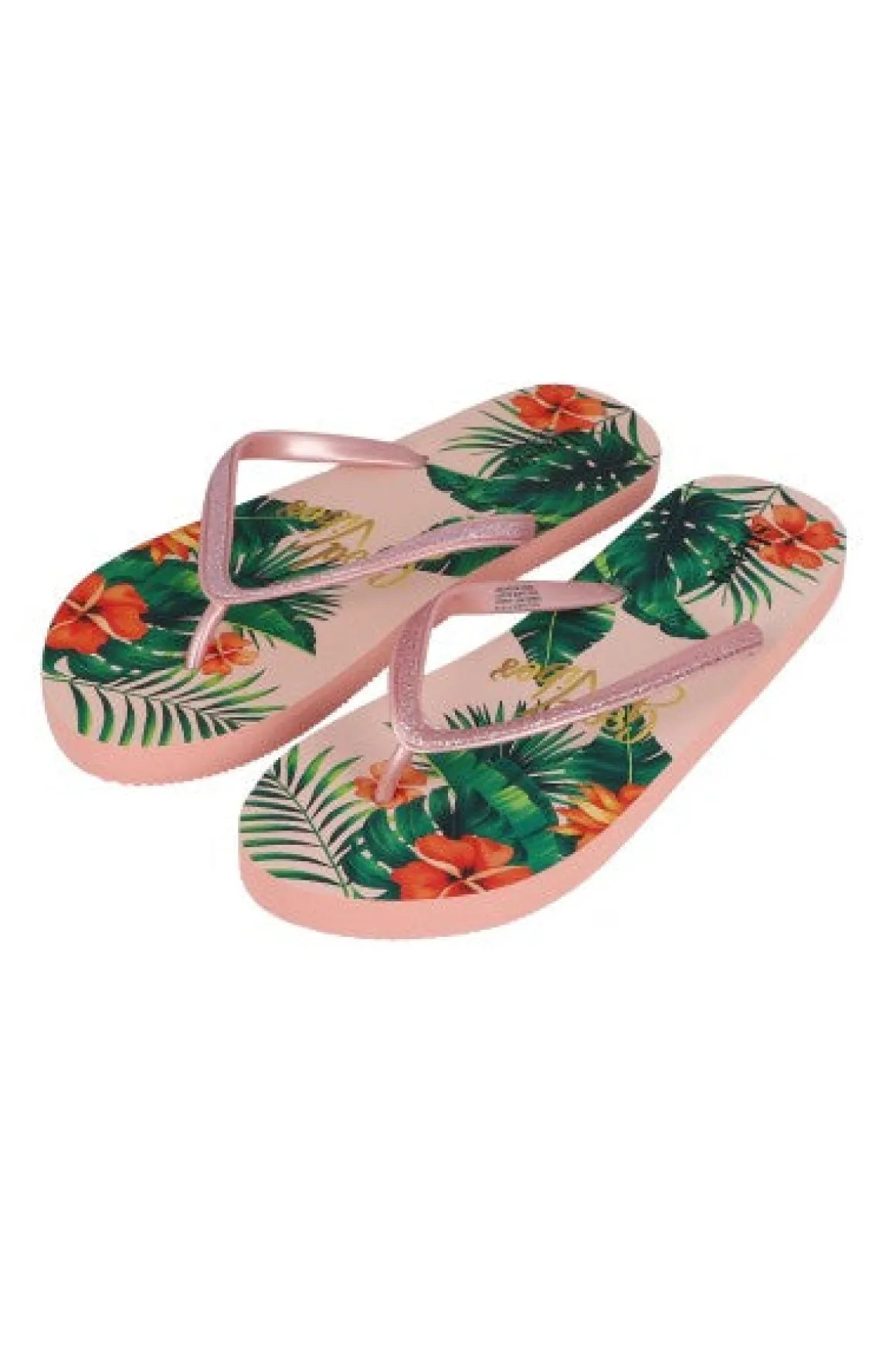 Flip flop pata de gallo con tiras de brillos. Estampado de hojas tropicales con frase Good Vibes.