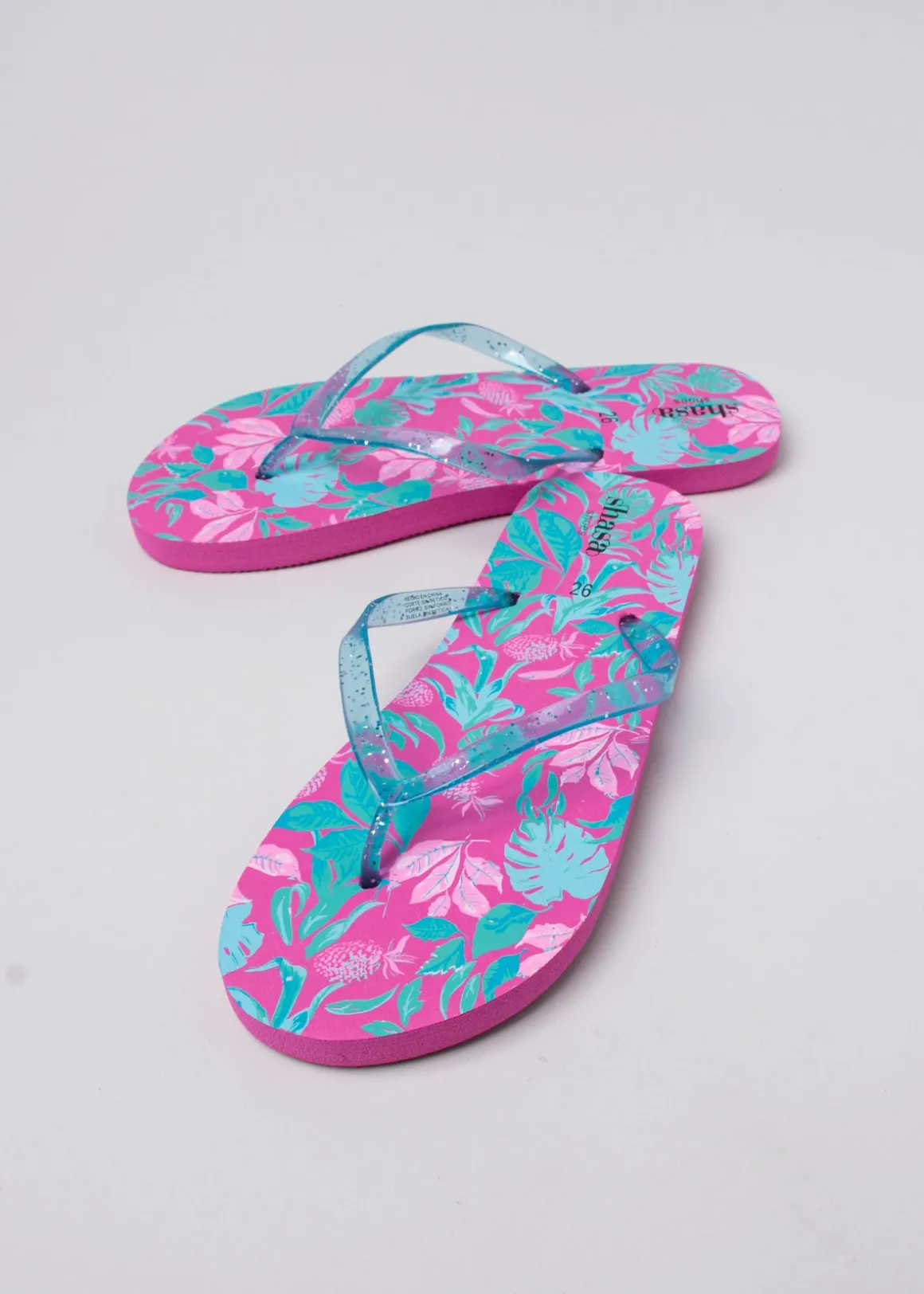 Flip flop suela de eva antiderrapante pata de gallo. Tiras transparentes con glitter. Estampado de hojas tropicales. Composición: Corte sintético. Sin forro. Suela sintética.