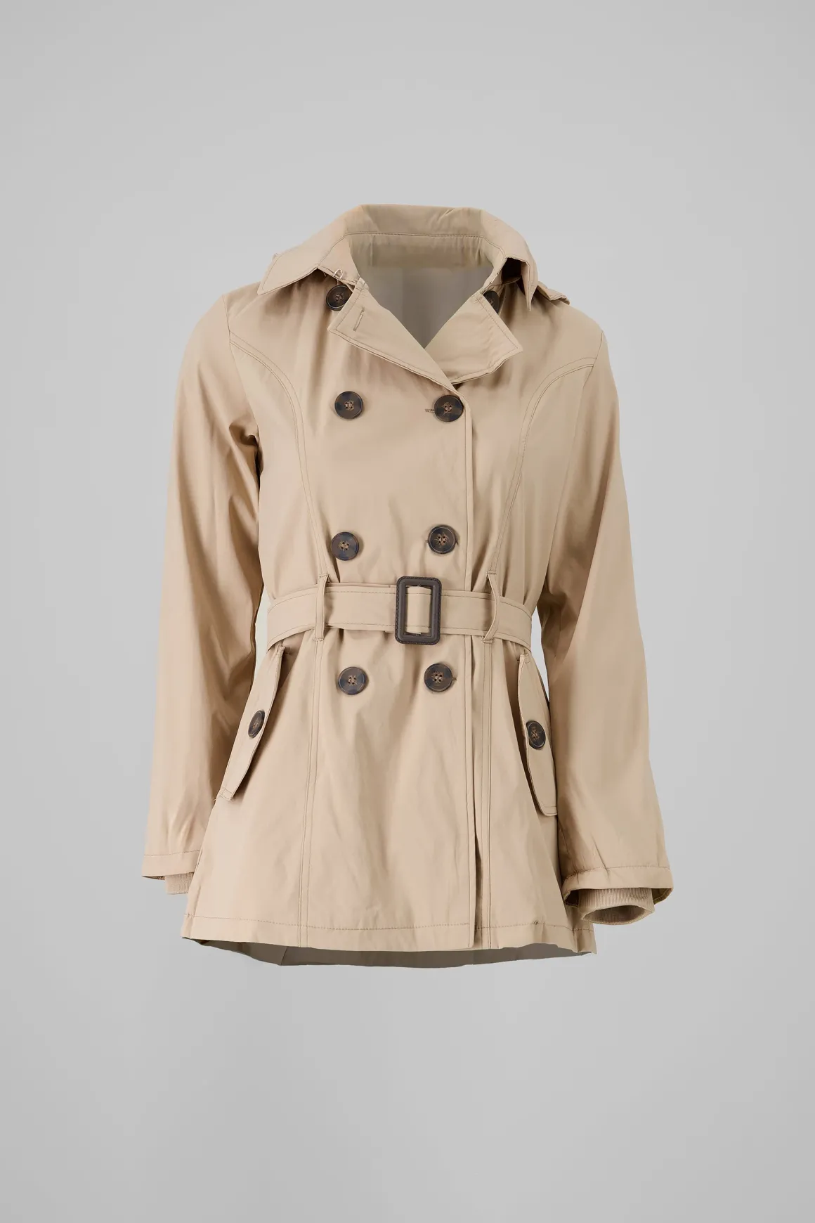 Esta gabardina monocolor es la prenda ideal que estabas buscando. Con un diseño corto y moderno, cuenta con un gorro que te protegerá con estilo. Los botones combinados a tono le dan un toque único, mientras que el cinturón ajustable resalta tu figura y agrega un detalle chic a tu look.