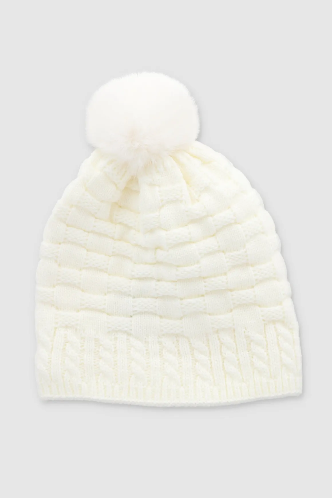 Gorro tejido con diseño de cuadros y borde acanalado. Pompón decorativo.