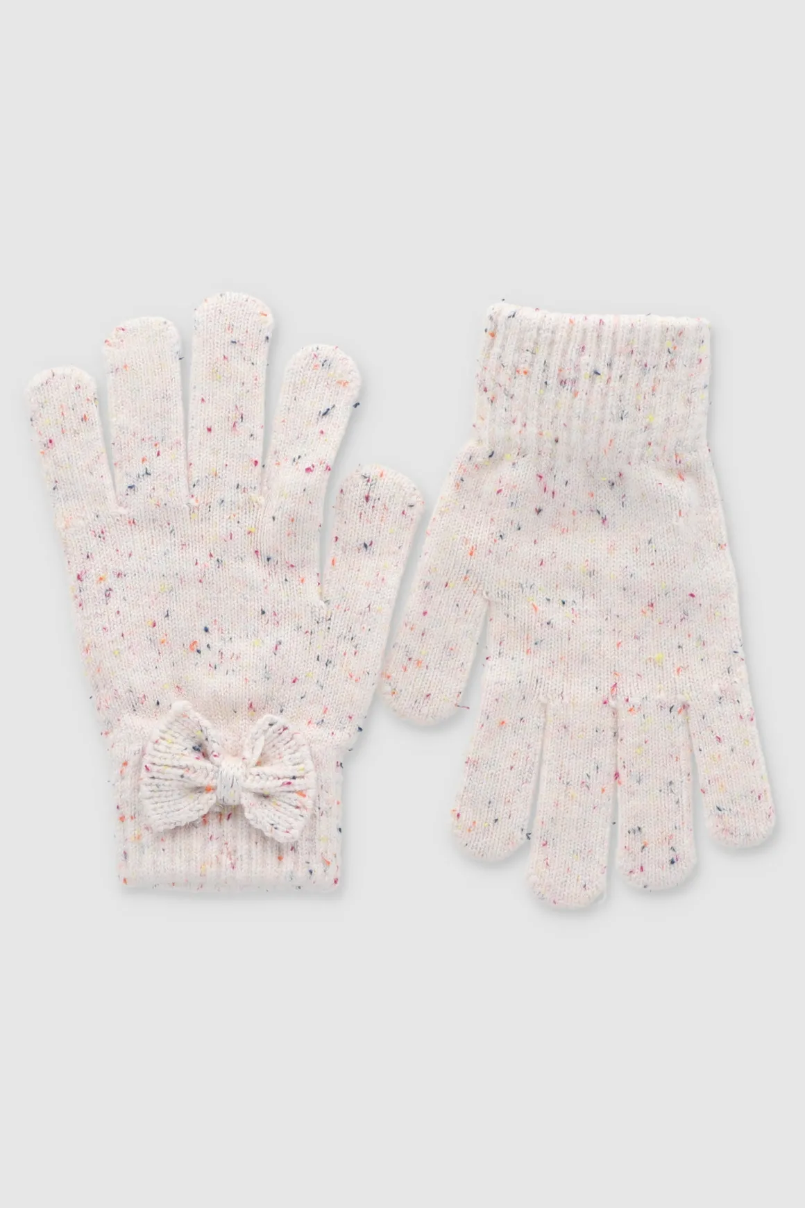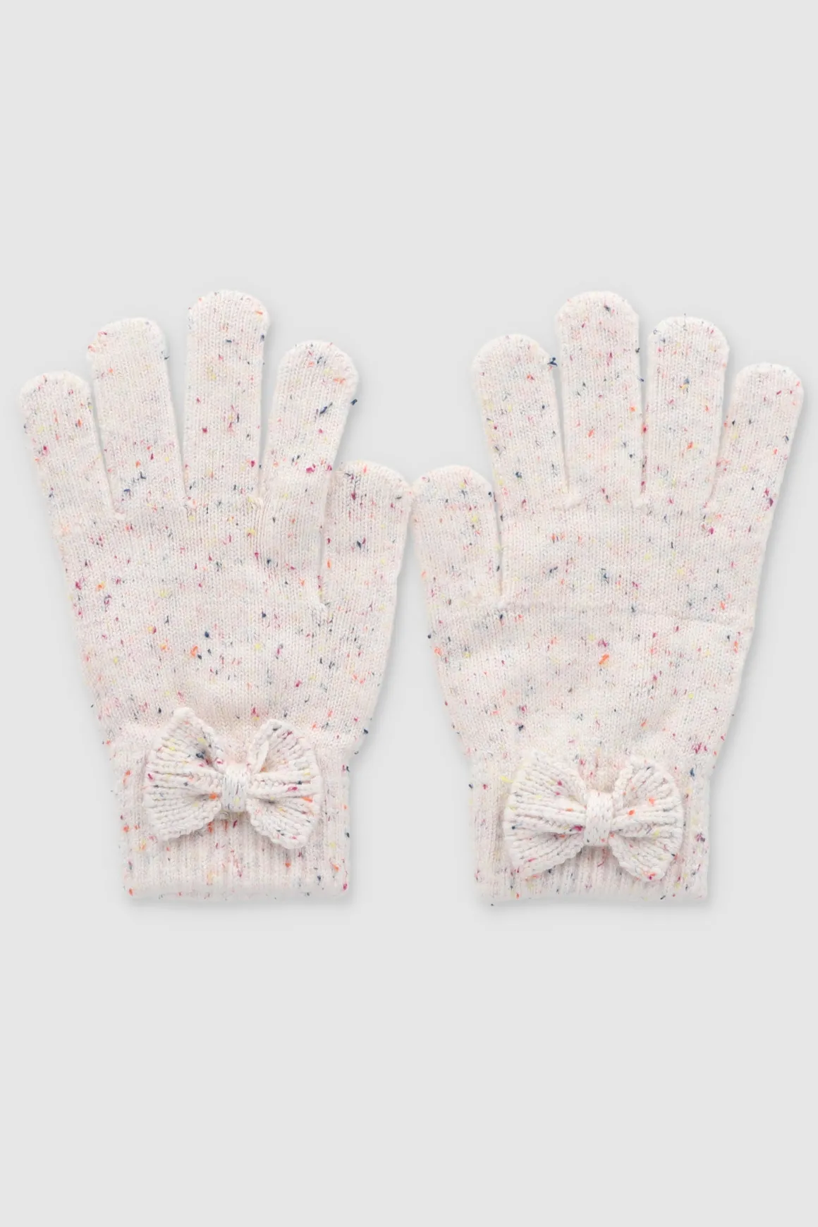 Guantes tejidos suaves acanalados con moño en la muñeca y diseño de puntos de colores.