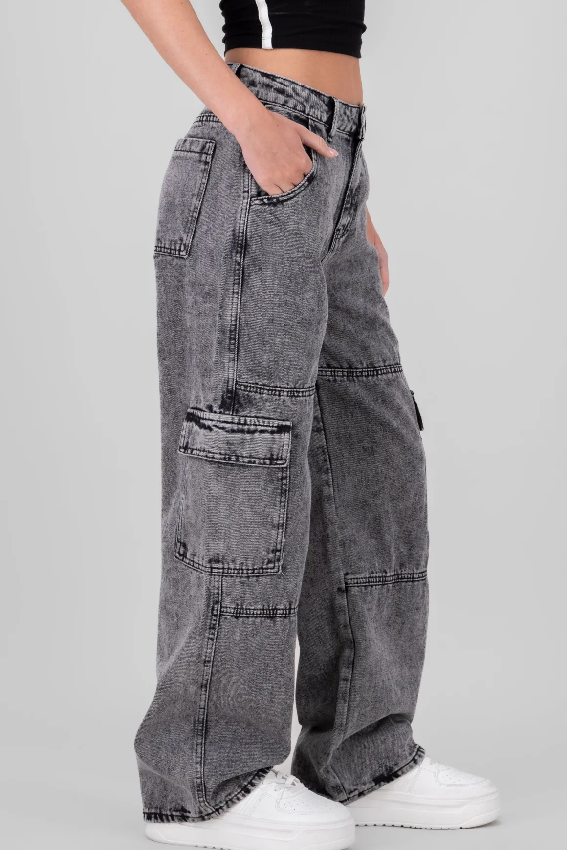 ¡Luce con estilo y funcionalidad con estos jeans deslave con bolsas cargo! Su diseño práctico es perfecto para un look juvenil y moderno.