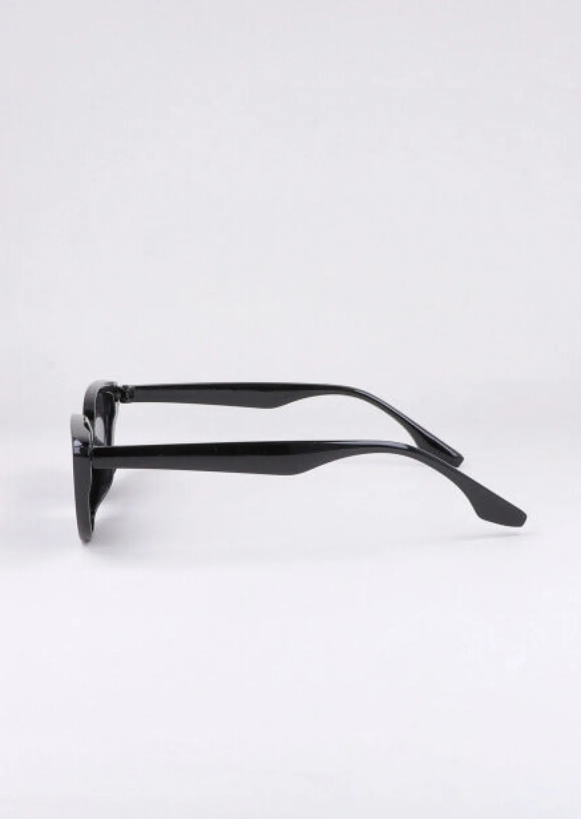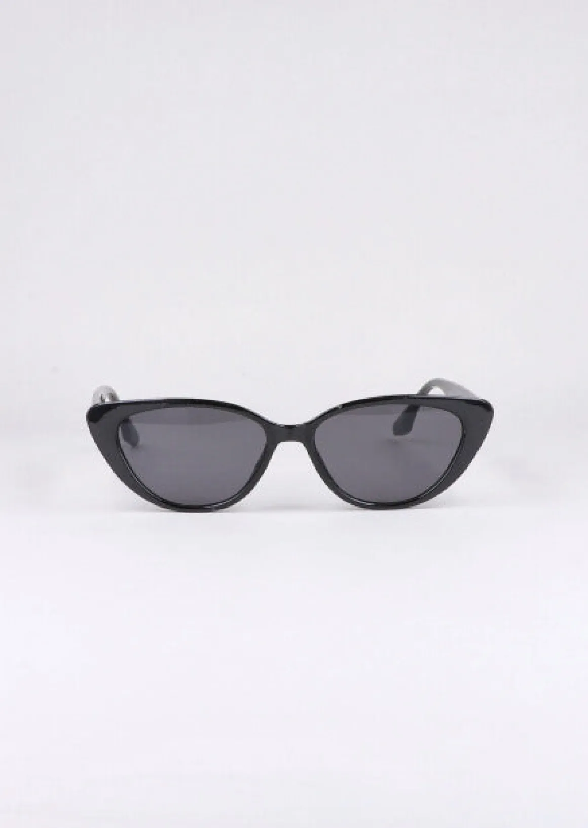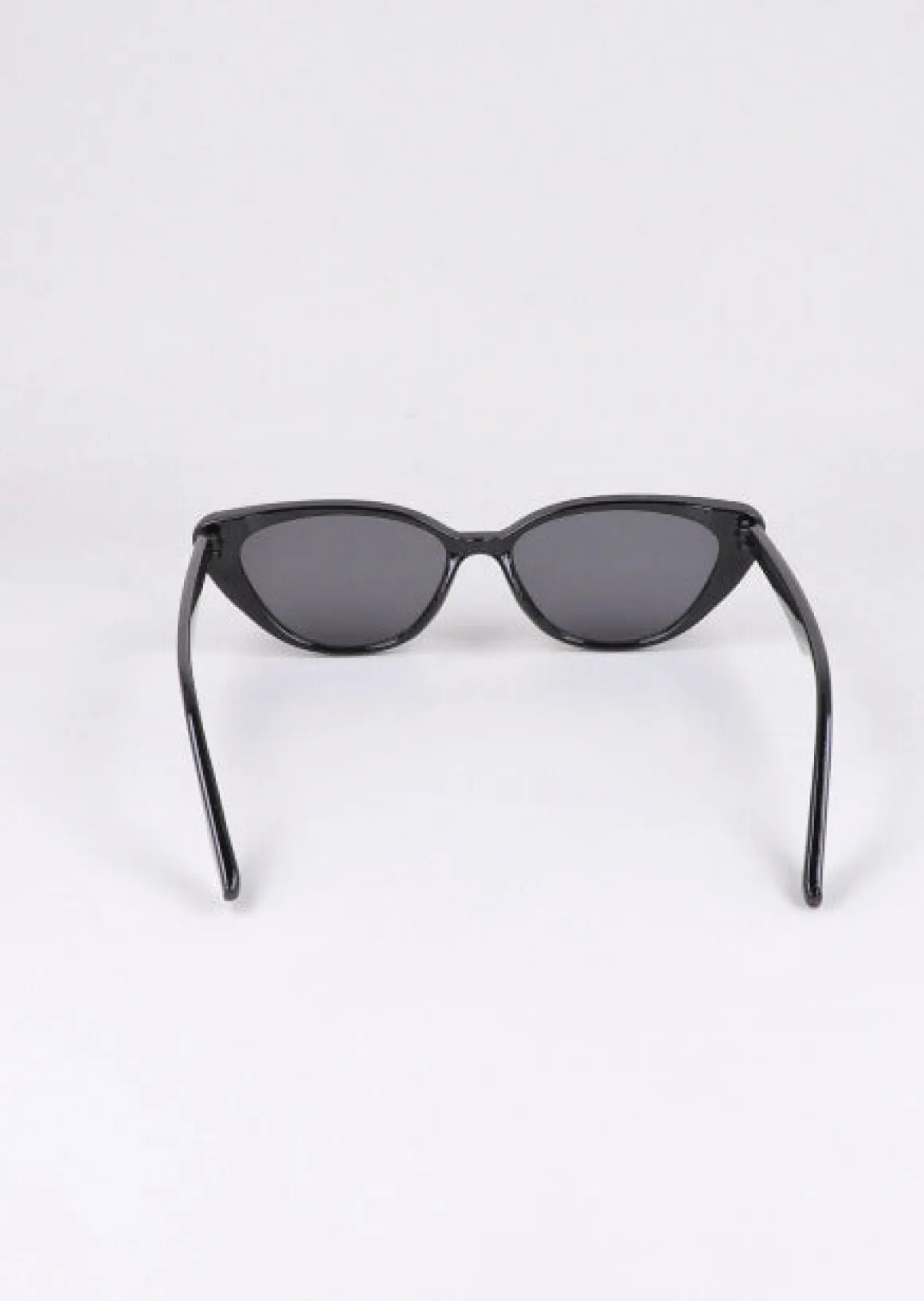 Lentes cat eye tintados con armazón delgado y patas con terminación curva..