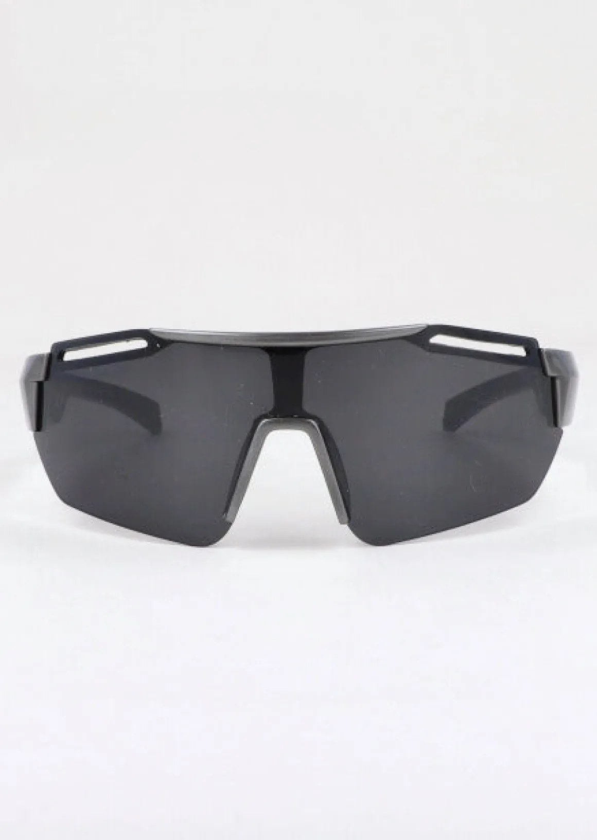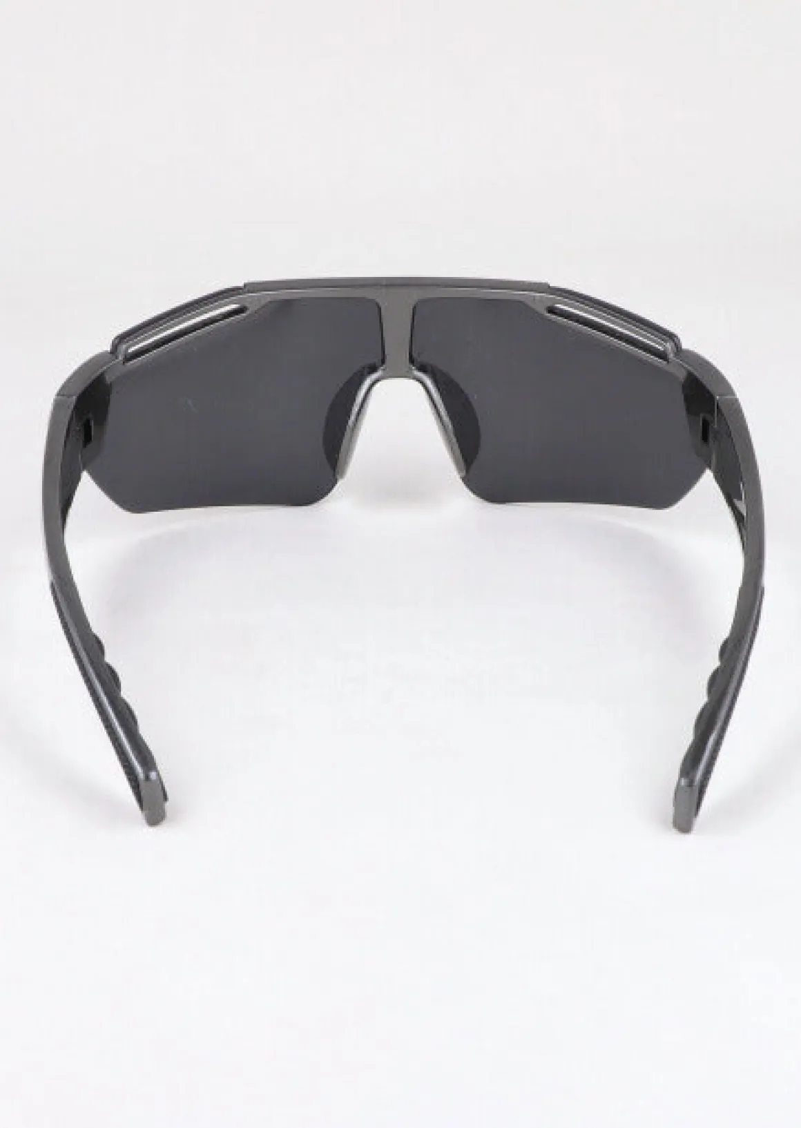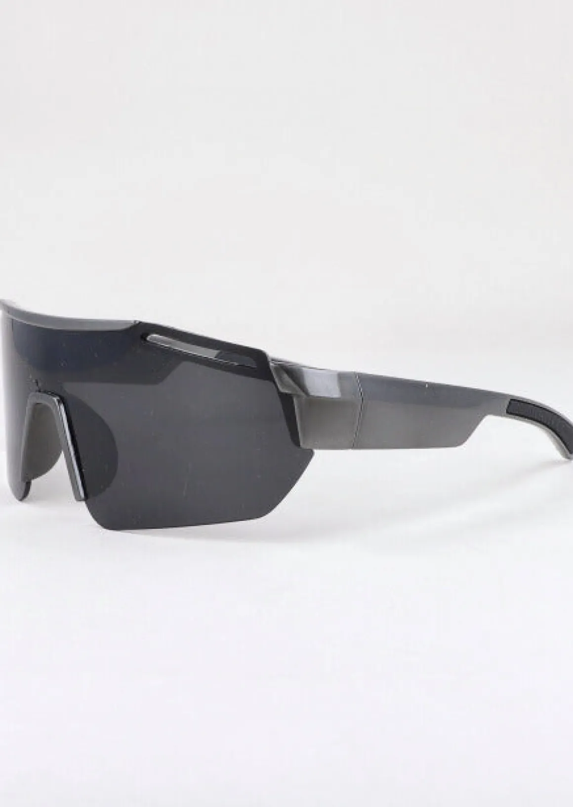 Lentes deportivos futuristas oscuros con patas anchas irregulares.